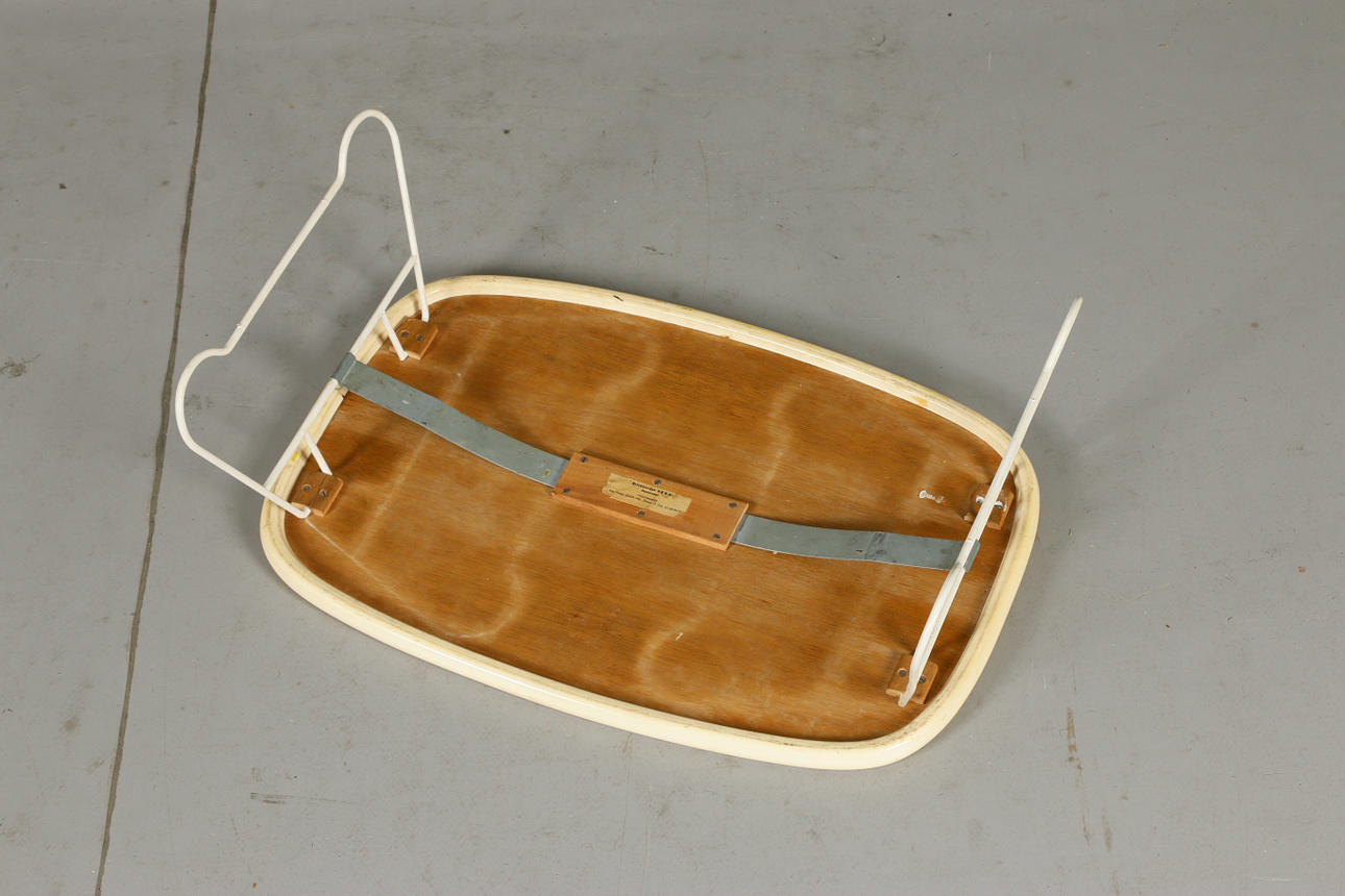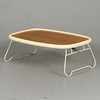 Tray table with teak top, plas edge, legs in lacquered metal, labeled Length 51, width 34, height 18.5 cm Legs foldable.