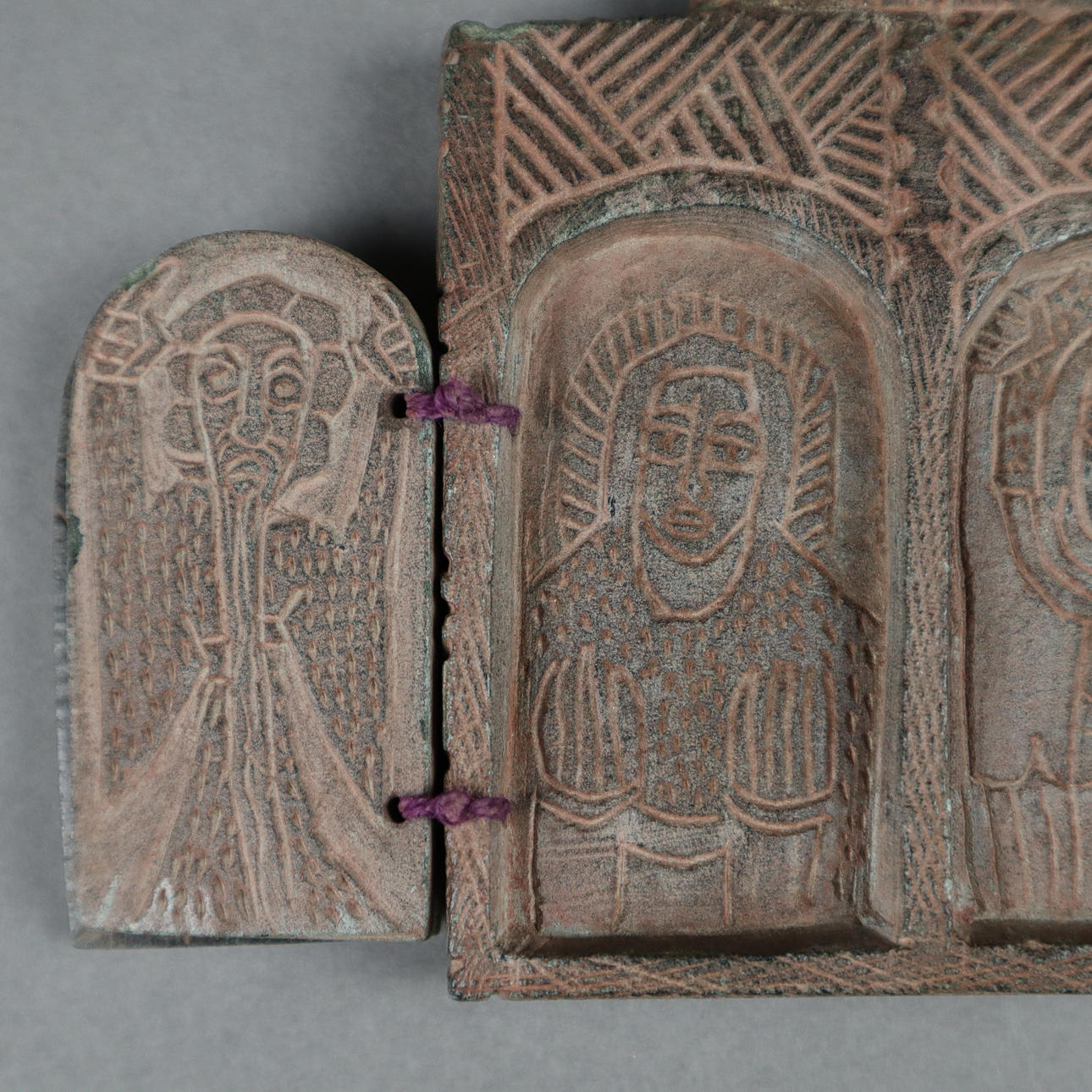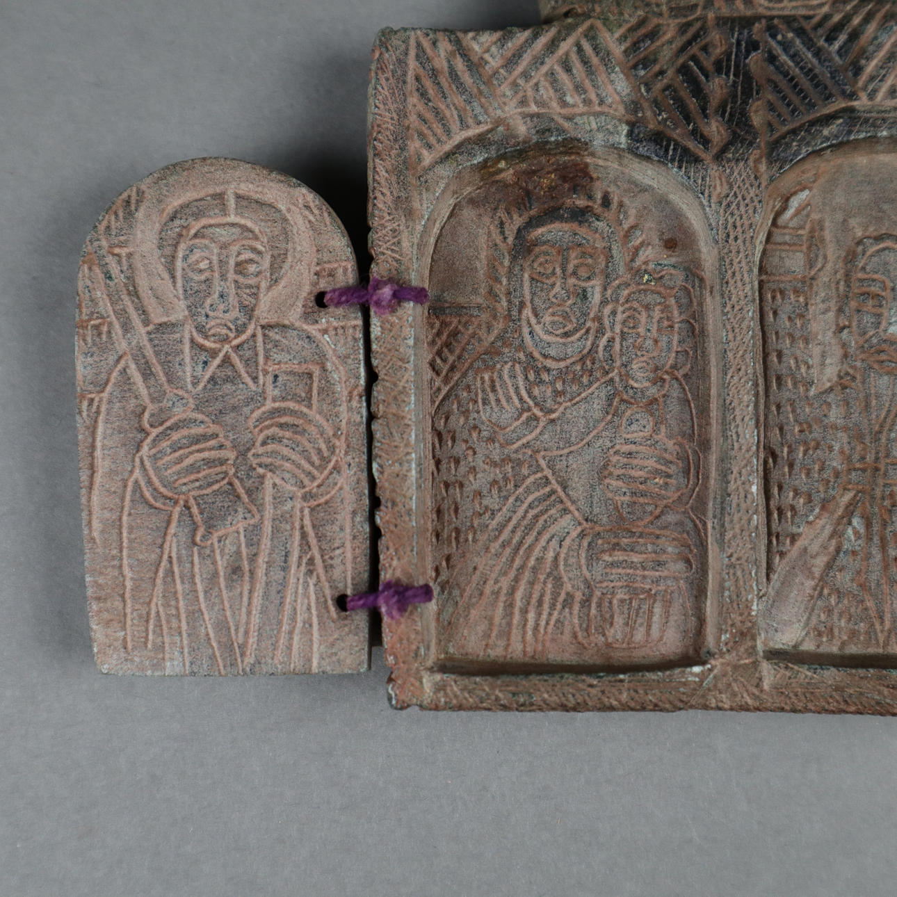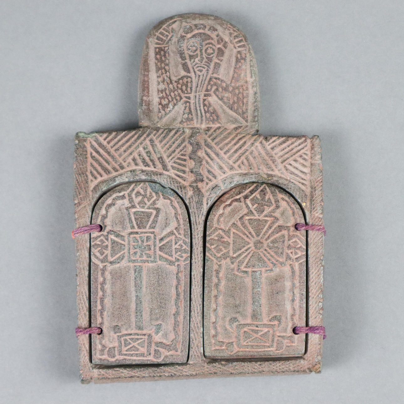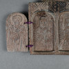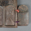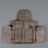 2 wing doors on each side, cross motifs on the outside, depictions of saints on the inside, approx. 12.8 x 8.5 cm, older.