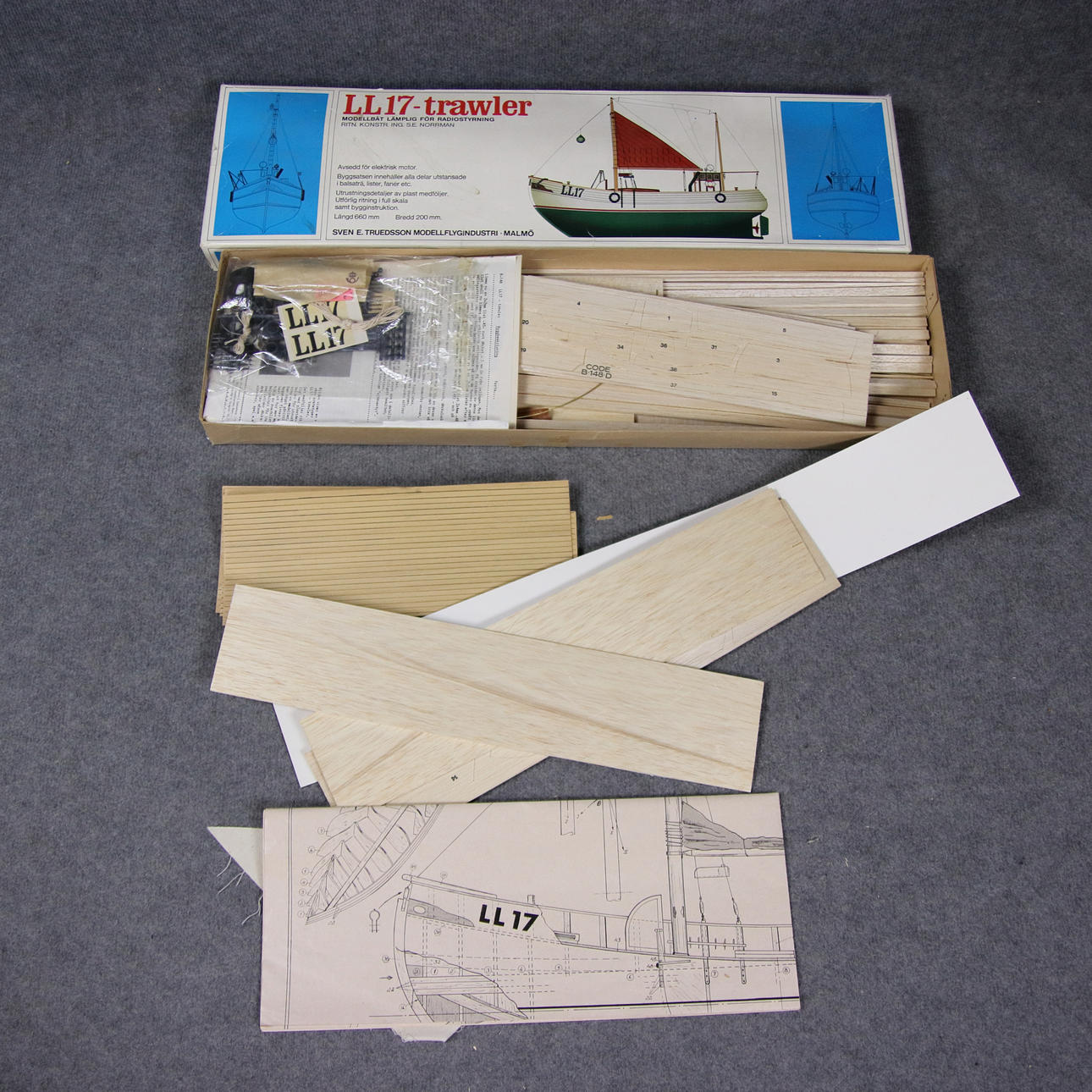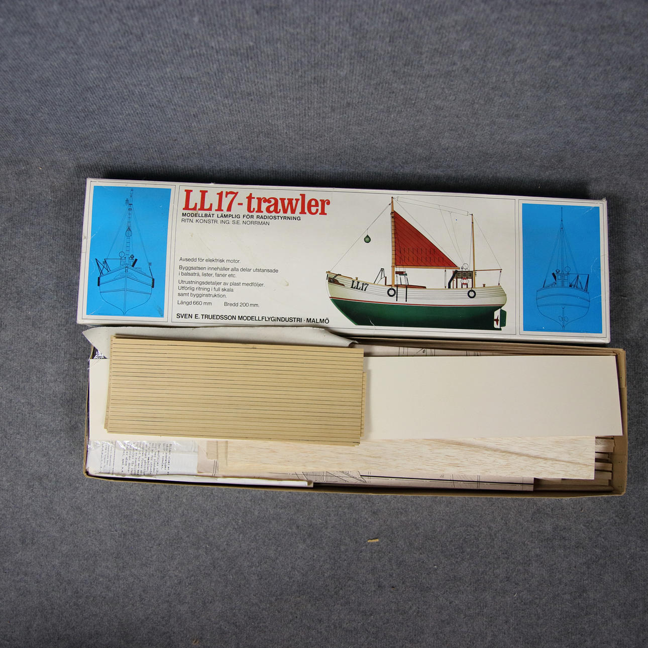 LL 17 Trawler. Suitable for radio control. Engine not included. Length 66, width 20 cm as fully built. Packaging 73 x 21 x 7 cm.