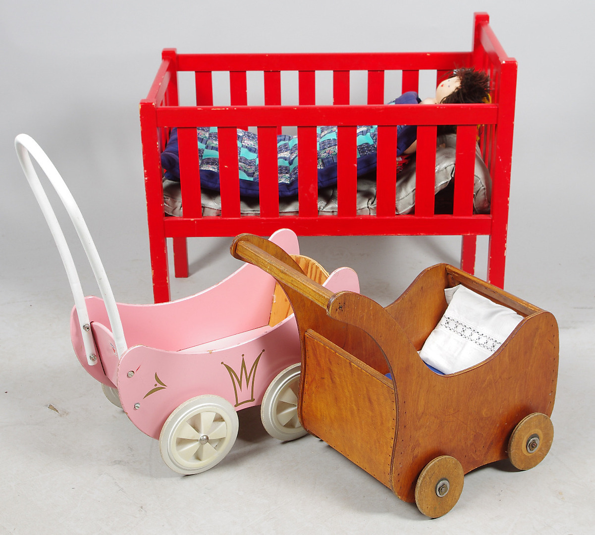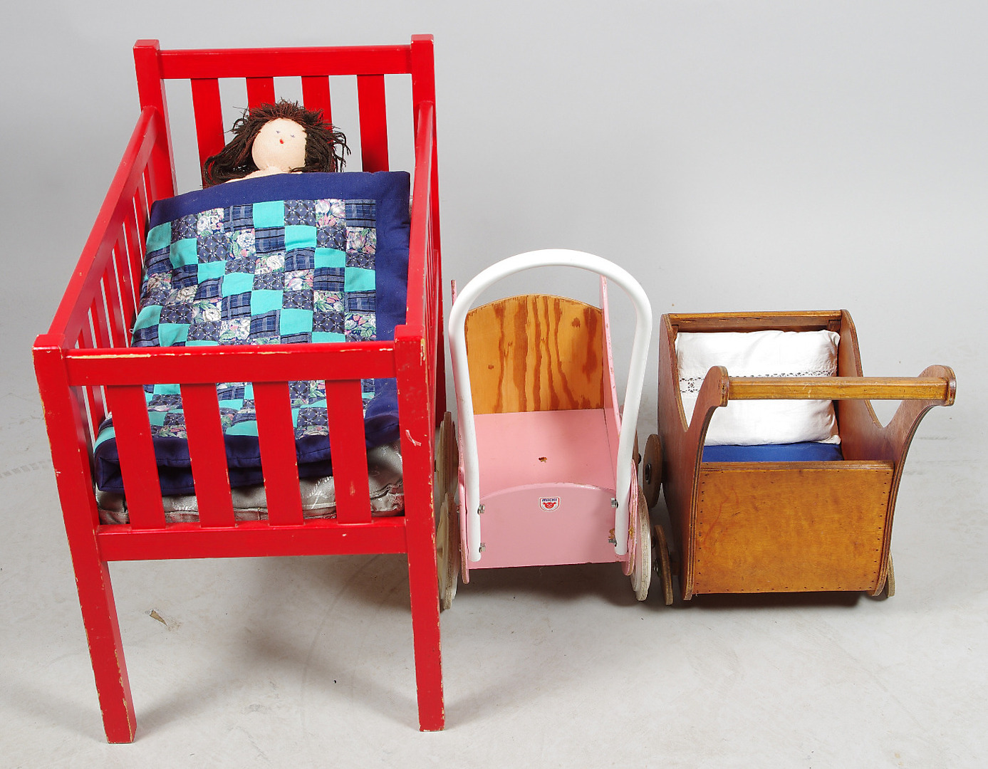147789. DOLL WAGONS AND DOLL BED, mid 1900s.