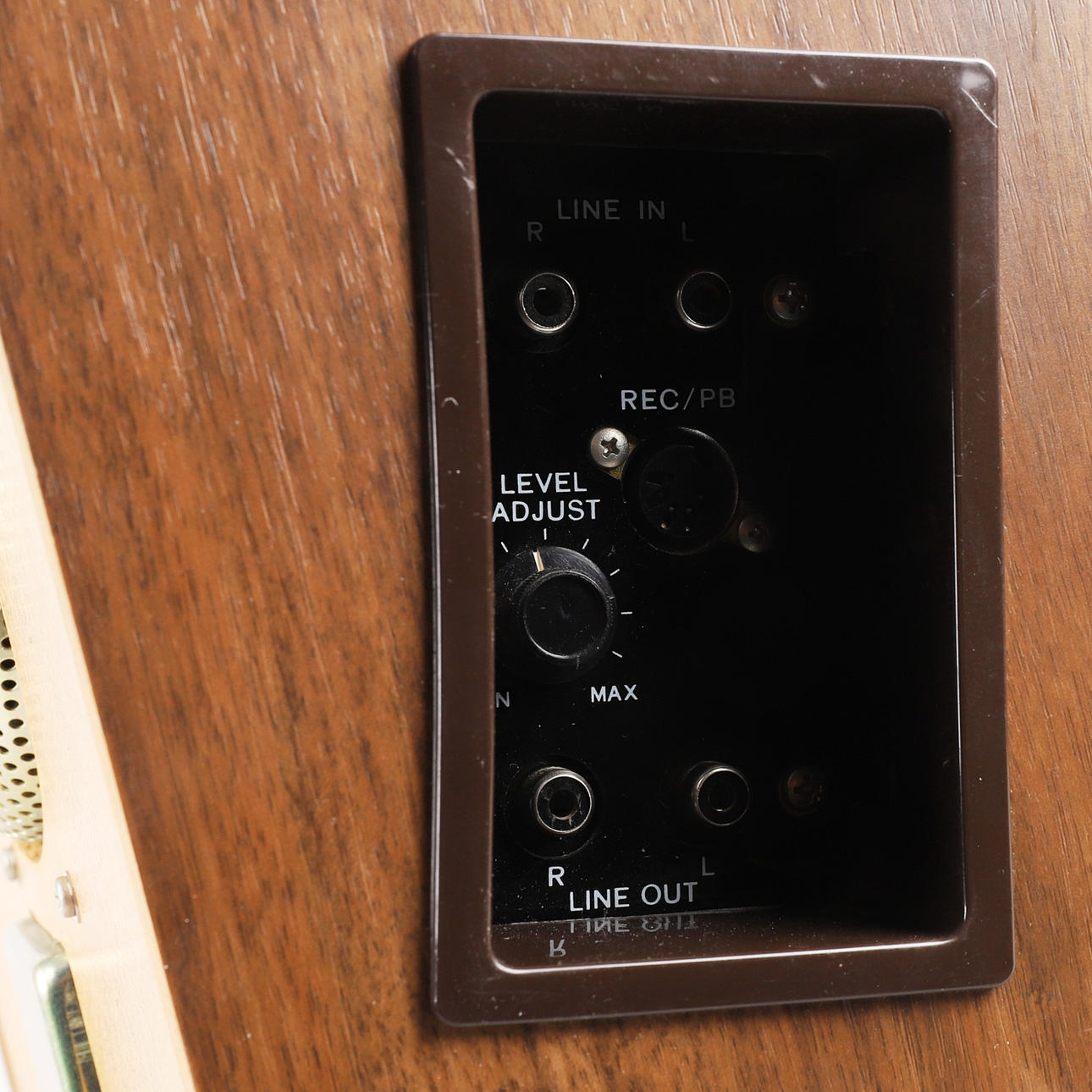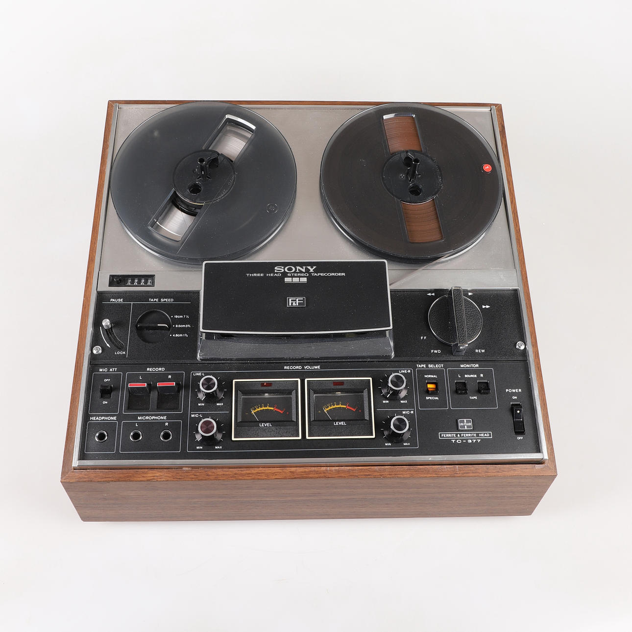 Reel tape player with three tone heads and three speeds. Chassis in teak veneer, dimensions approx. 42x38 cm, depth 24 cm.