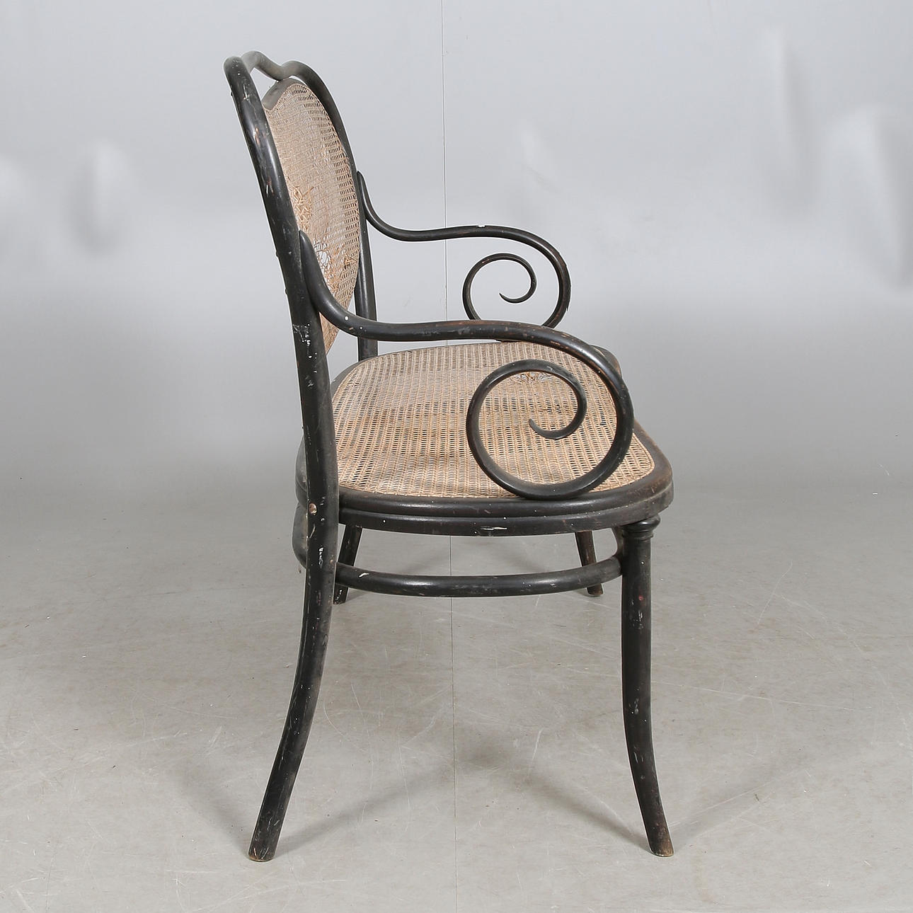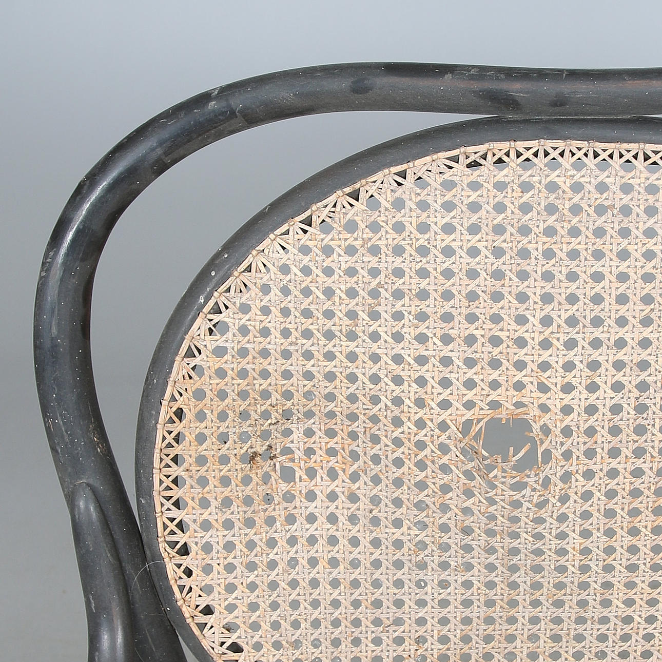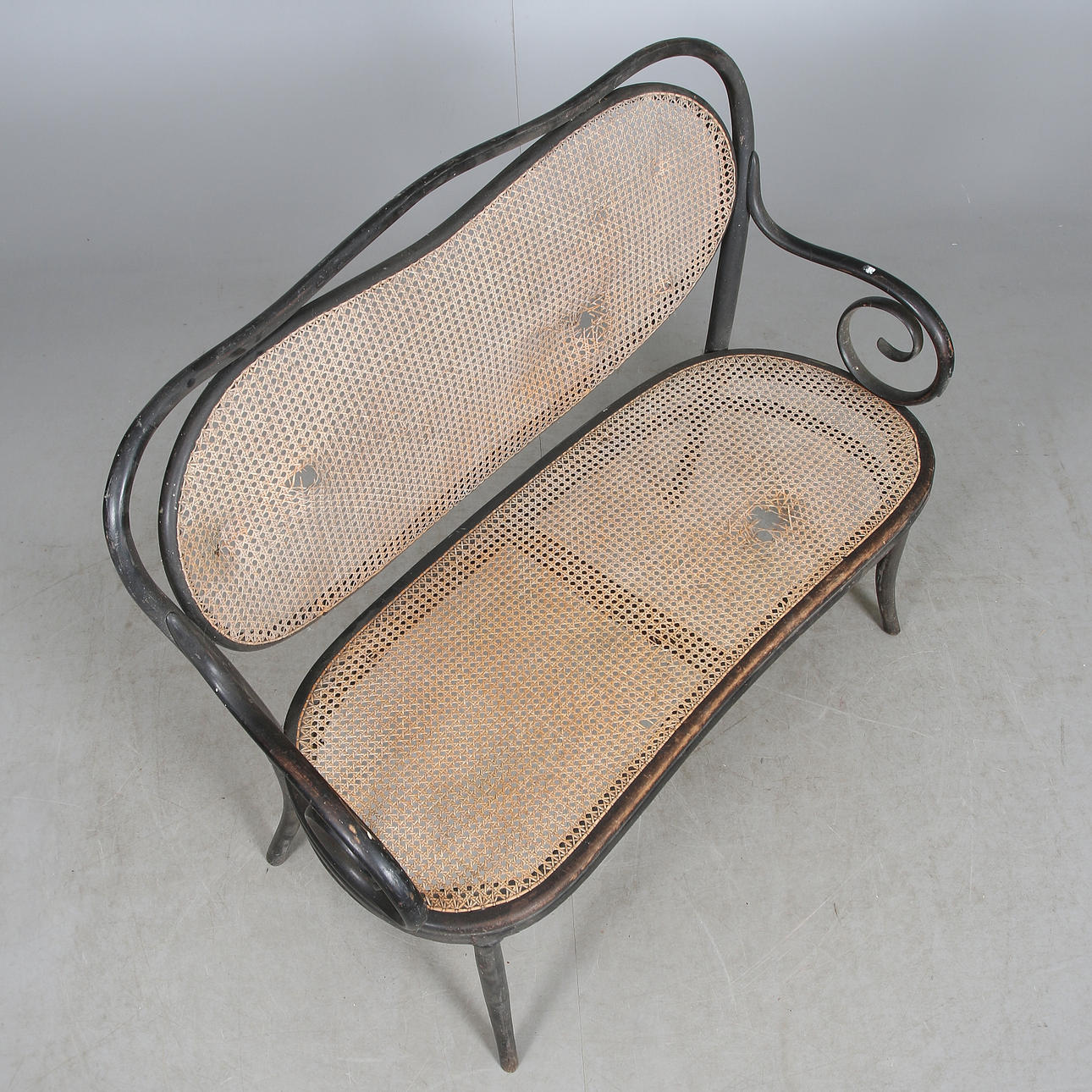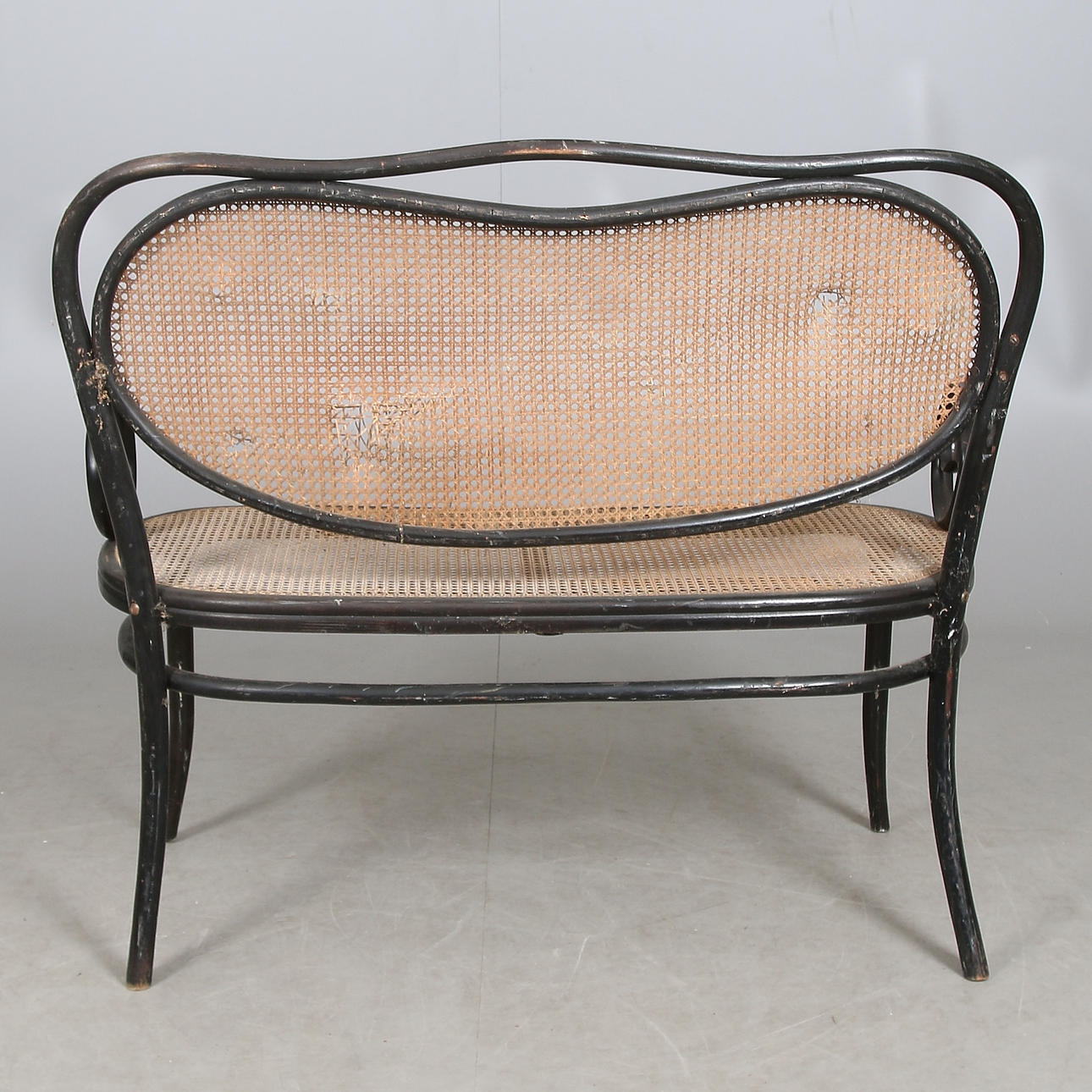 Frame of painted bentwood. Seat and back made of braided rattan. Length approx. 113, width 48, seat height 48, back height 100 cm.