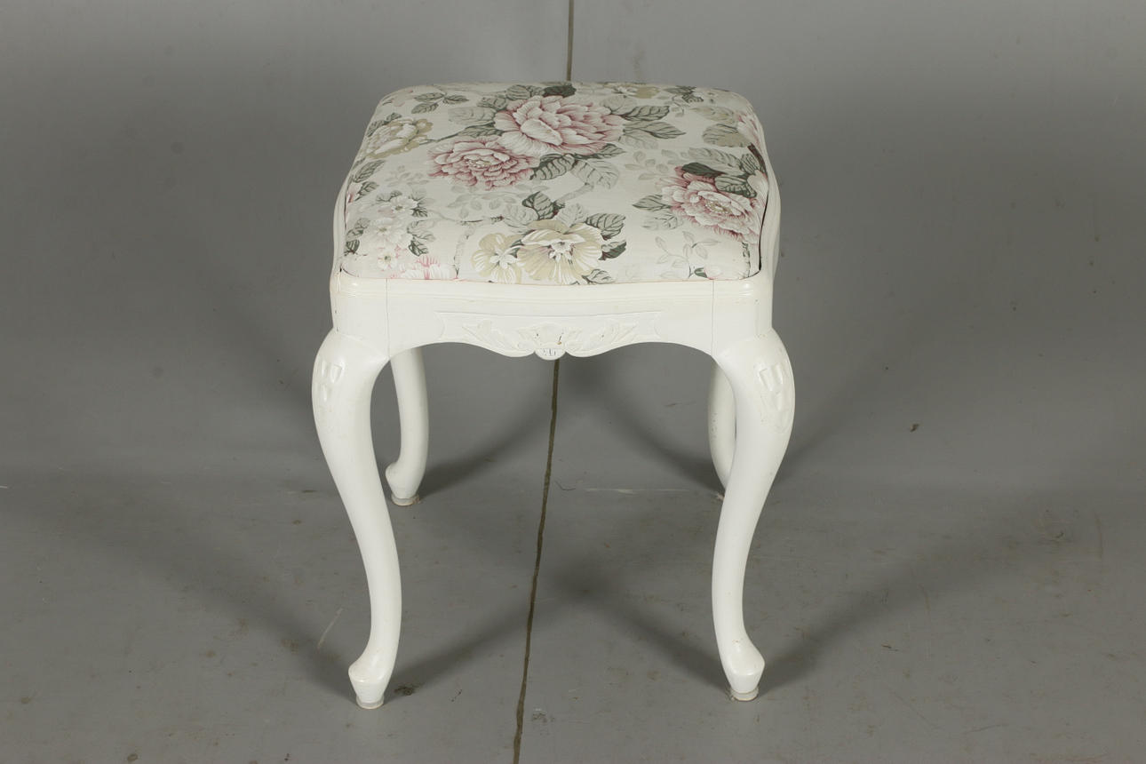 Stool with cut decoration, fixed upholstery over upholstered seat, painted Length and width 42, height 47 cm.