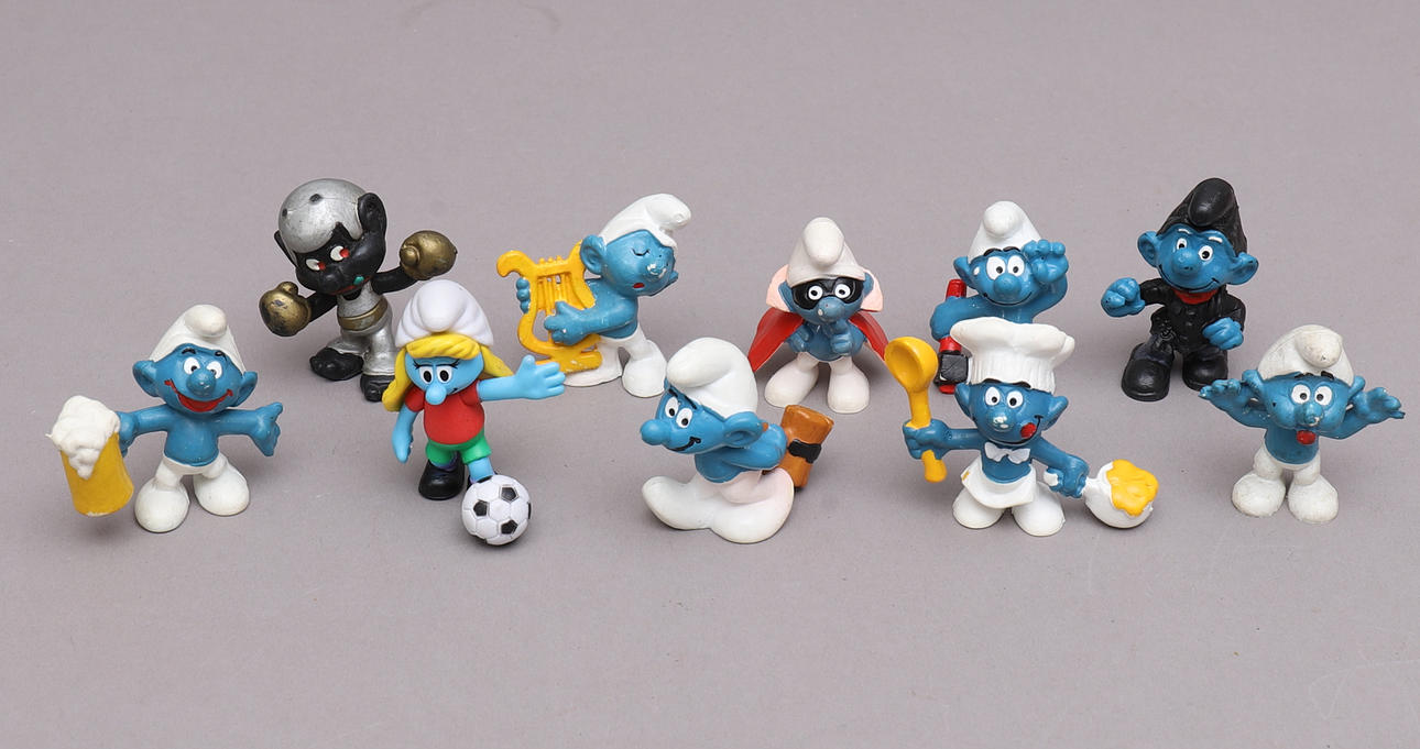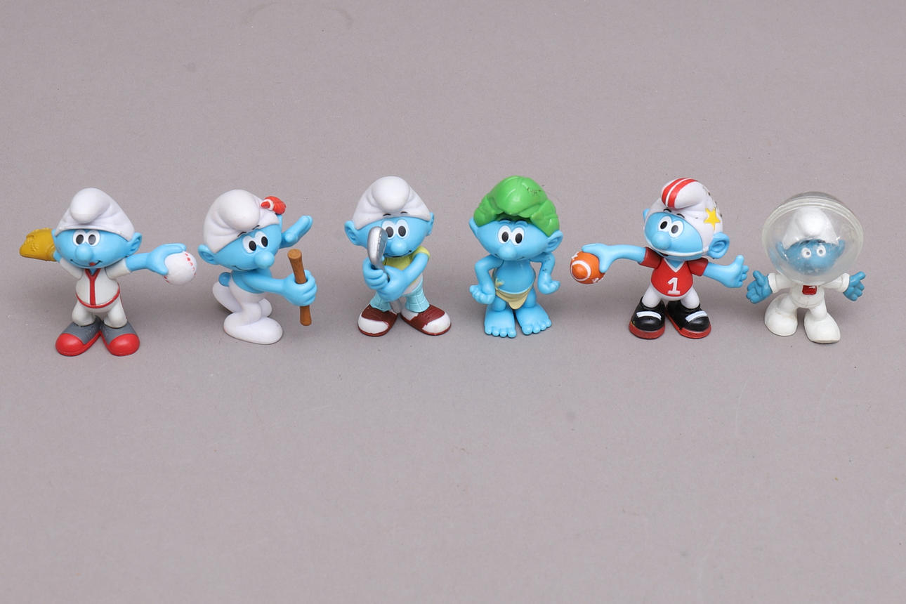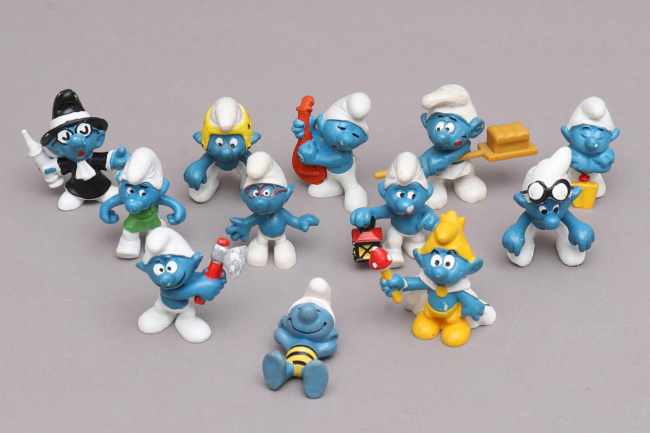 37 plastic figures: 22 Peyo Bully West Germany, height approx. 5.5 cm 6 Peyo Jakks China, height approx. 6.5 cm 2 McD Peyo China, height approx. 8 cm 1 hard plastic unmarked Gammelsmurf, probably Kinderäggs toy, height approx. 3 .7 cm Doll service, 5 parts, plastic, Peyo, jug height approx. 7 cm 8 series albums, The Smurfs' Adventures; The Smurfs Get Baby Trouble, The Smurfs and the Clock Backwards, The Black Smurfs, Smurf Stories, Astrosmurf. The Olympic Smurfs, The Smurfs and Kruxelikrax, The Super Smurf.