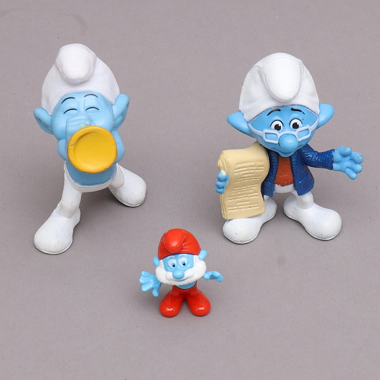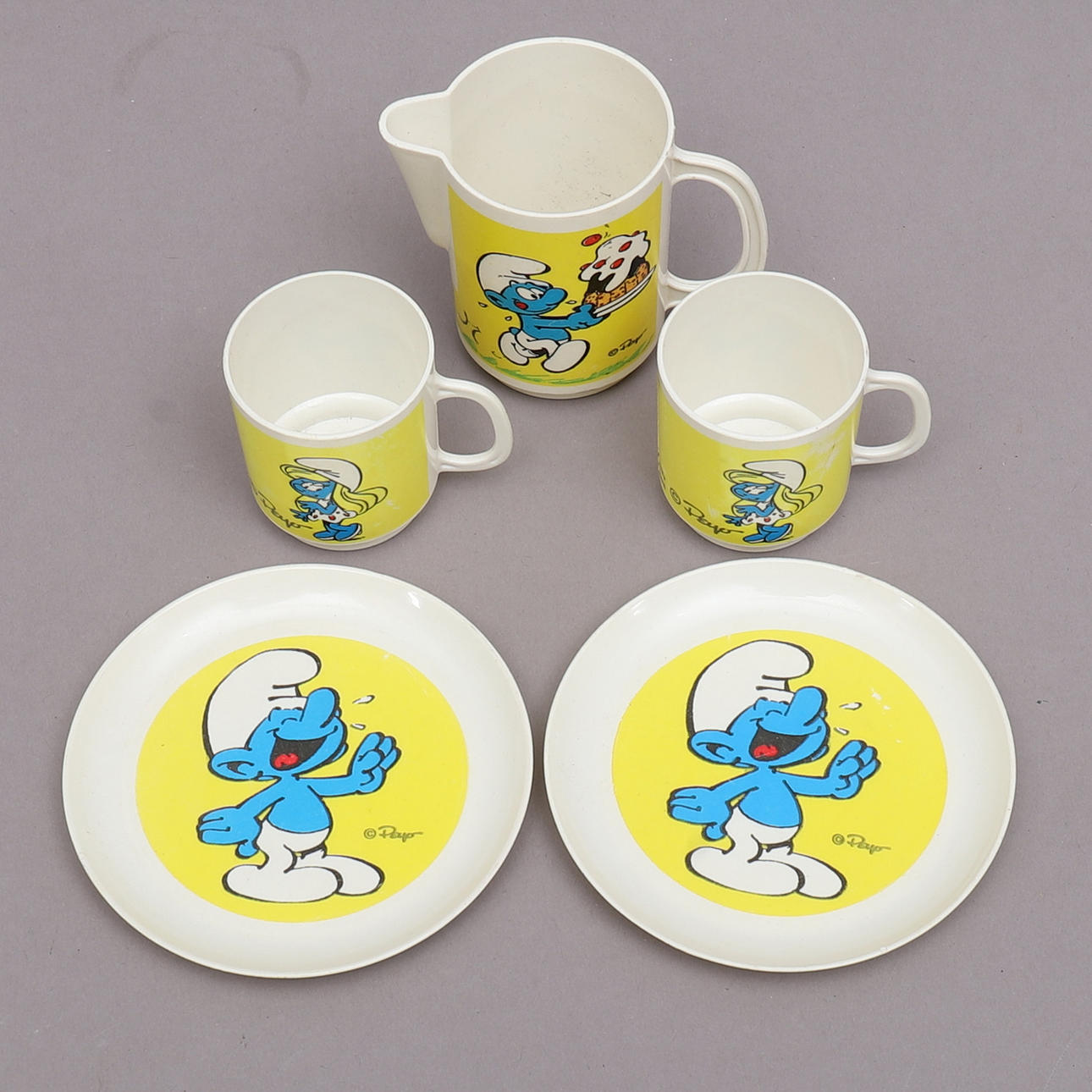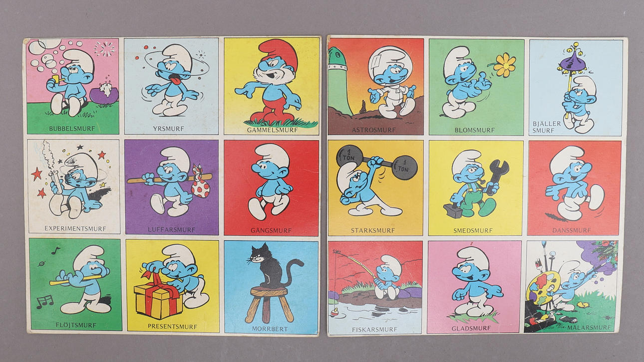 37 plastic figures: 22 Peyo Bully West Germany, height approx. 5.5 cm 6 Peyo Jakks China, height approx. 6.5 cm 2 McD Peyo China, height approx. 8 cm 1 hard plastic unmarked Gammelsmurf, probably Kinderäggs toy, height approx. 3 .7 cm Doll service, 5 parts, plastic, Peyo, jug height approx. 7 cm 8 series albums, The Smurfs' Adventures; The Smurfs Get Baby Trouble, The Smurfs and the Clock Backwards, The Black Smurfs, Smurf Stories, Astrosmurf. The Olympic Smurfs, The Smurfs and Kruxelikrax, The Super Smurf.