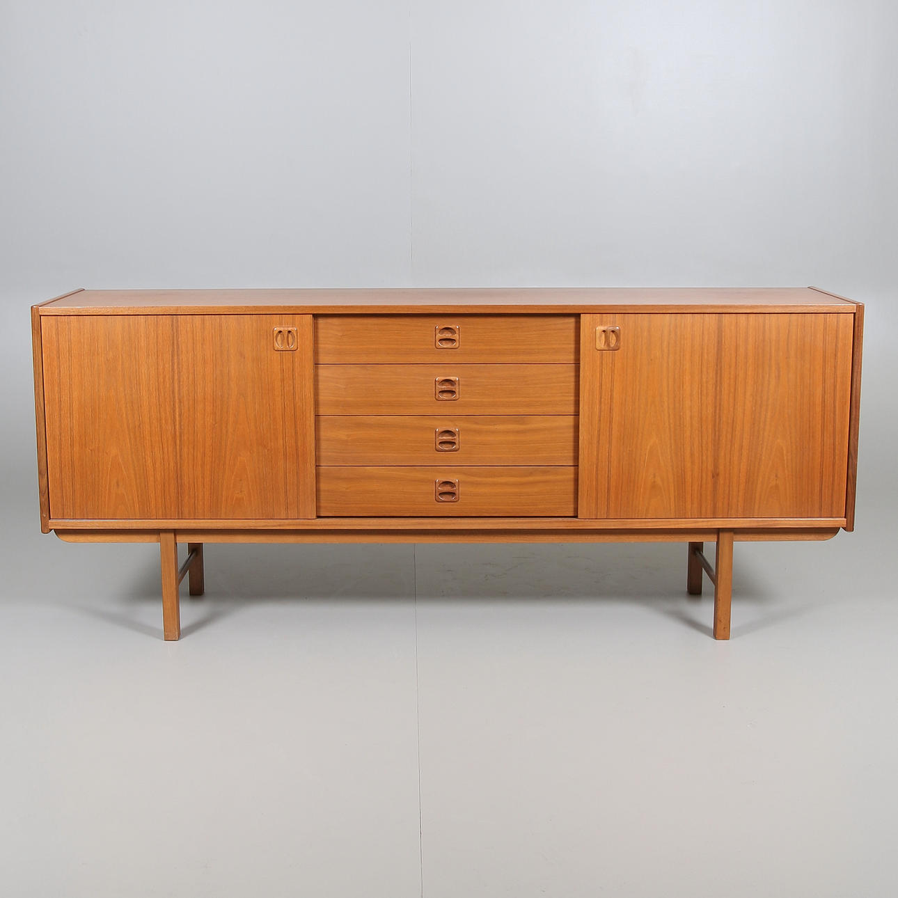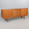 Teak veneer. 4 drawers and two sliding doors. Length 182, width 42, height 76 cm.