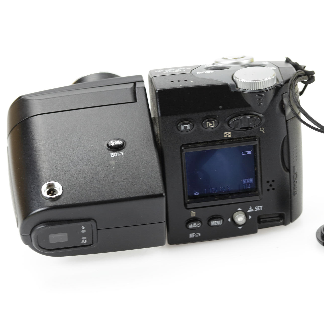 In original box with charger, shoulder strap, cables, 128MB memory card and 2 batteries.