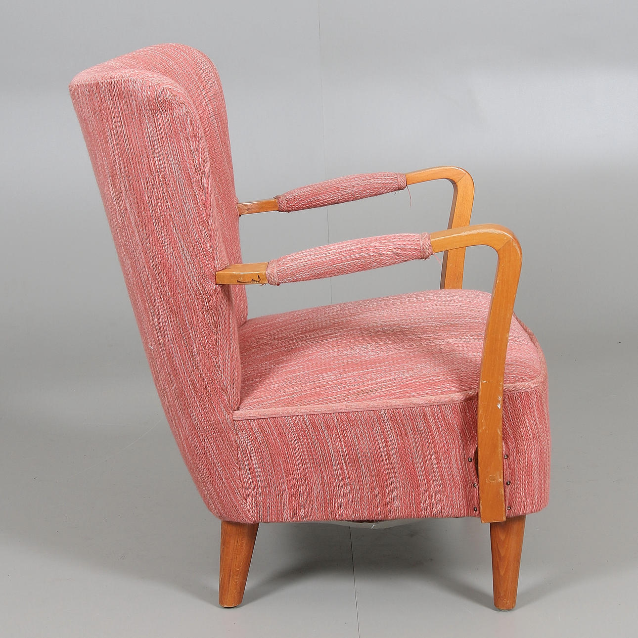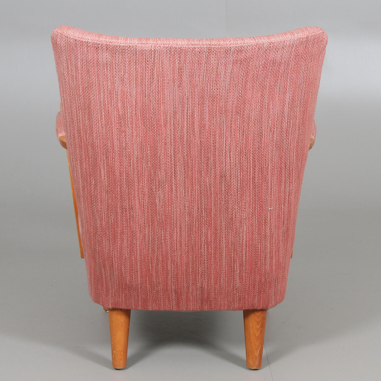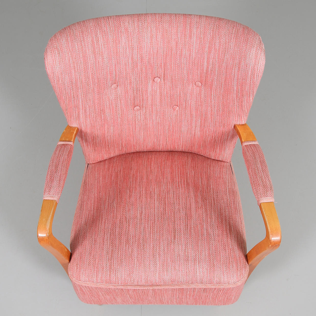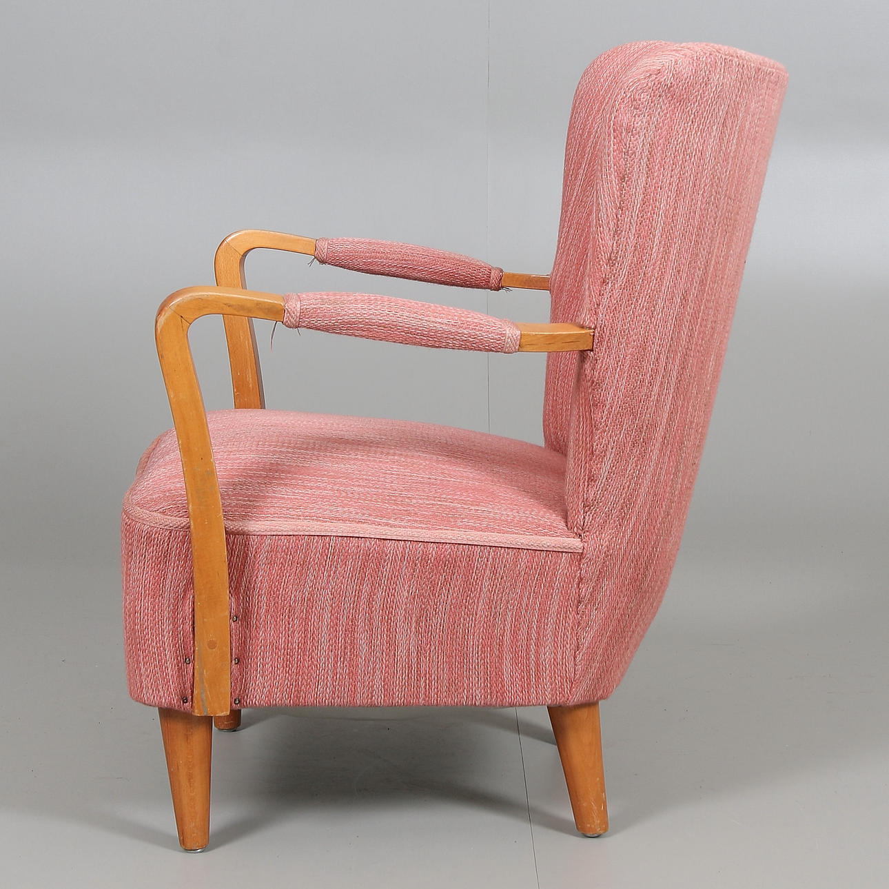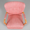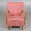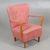Deep stitched back. Lacquered beech armrest. Length approx. 66, width 61, seat height 42, back height 83 cm.