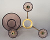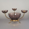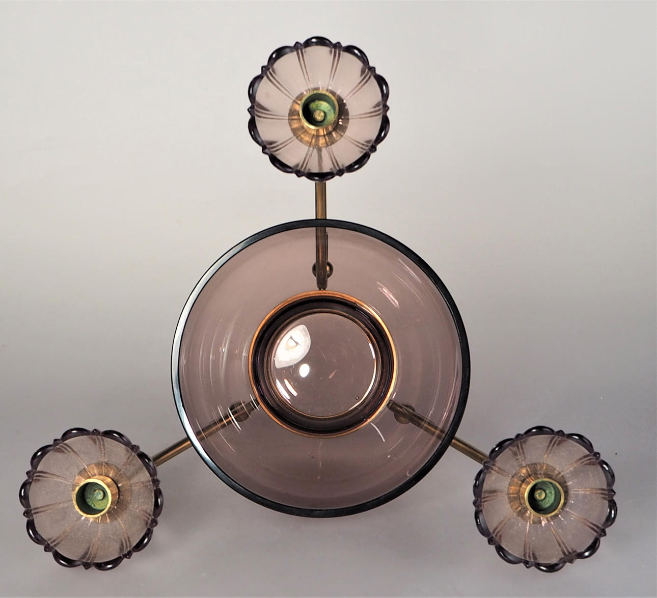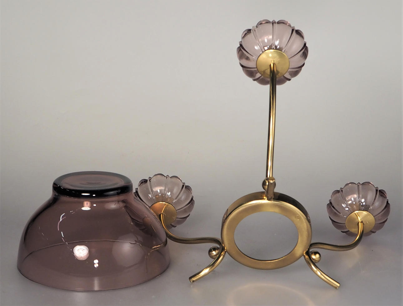 Brass and purple glass. Molded glass cuffs in the shape of flowers. Too small lights. Height 12 cm. Diameter approx. 22 cm.