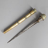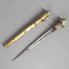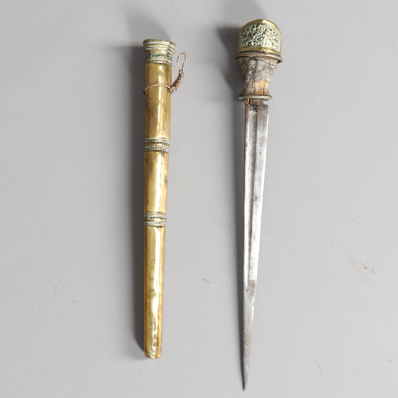 26cm steel blade with engraved decoration, fish skin grip pierced brass pommel with traces of red stone insets, brass scabbard, 36cm overall length.