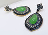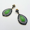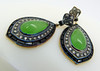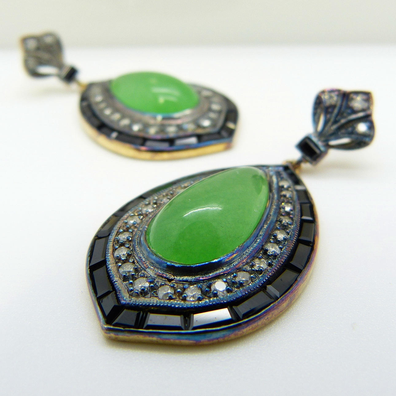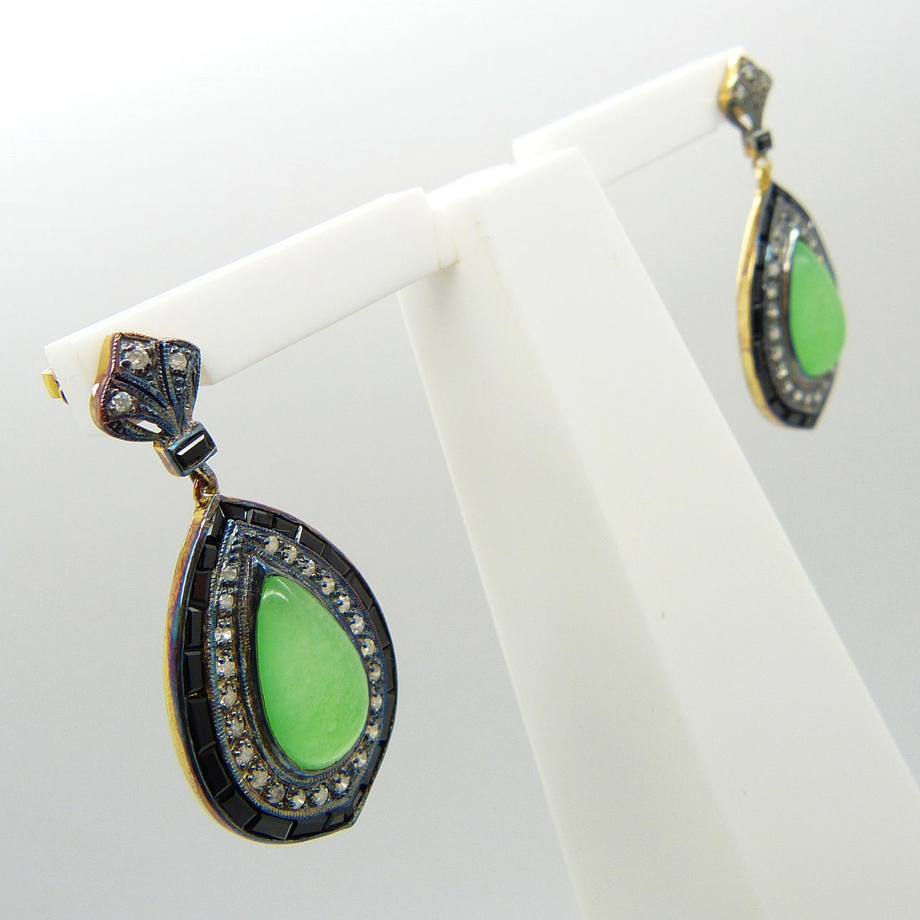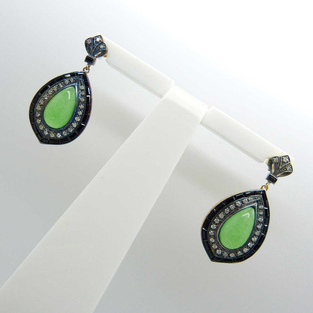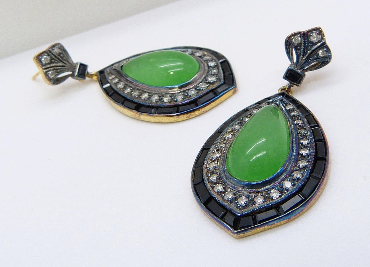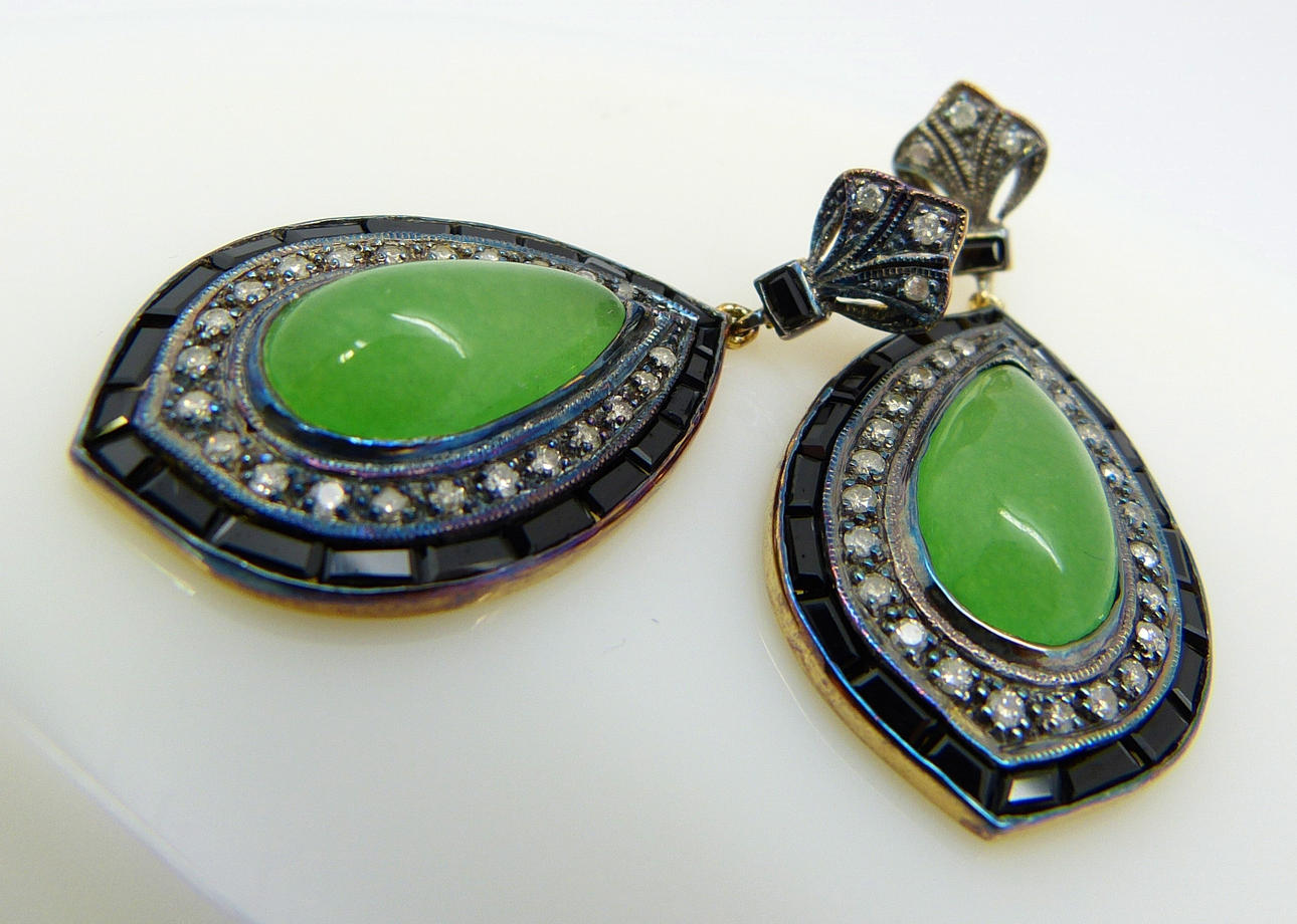 A pair of vintage-style / Art Deco-style tear drop cabochon jade, diamond and black onyx earrings, boxed.