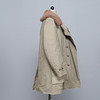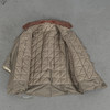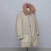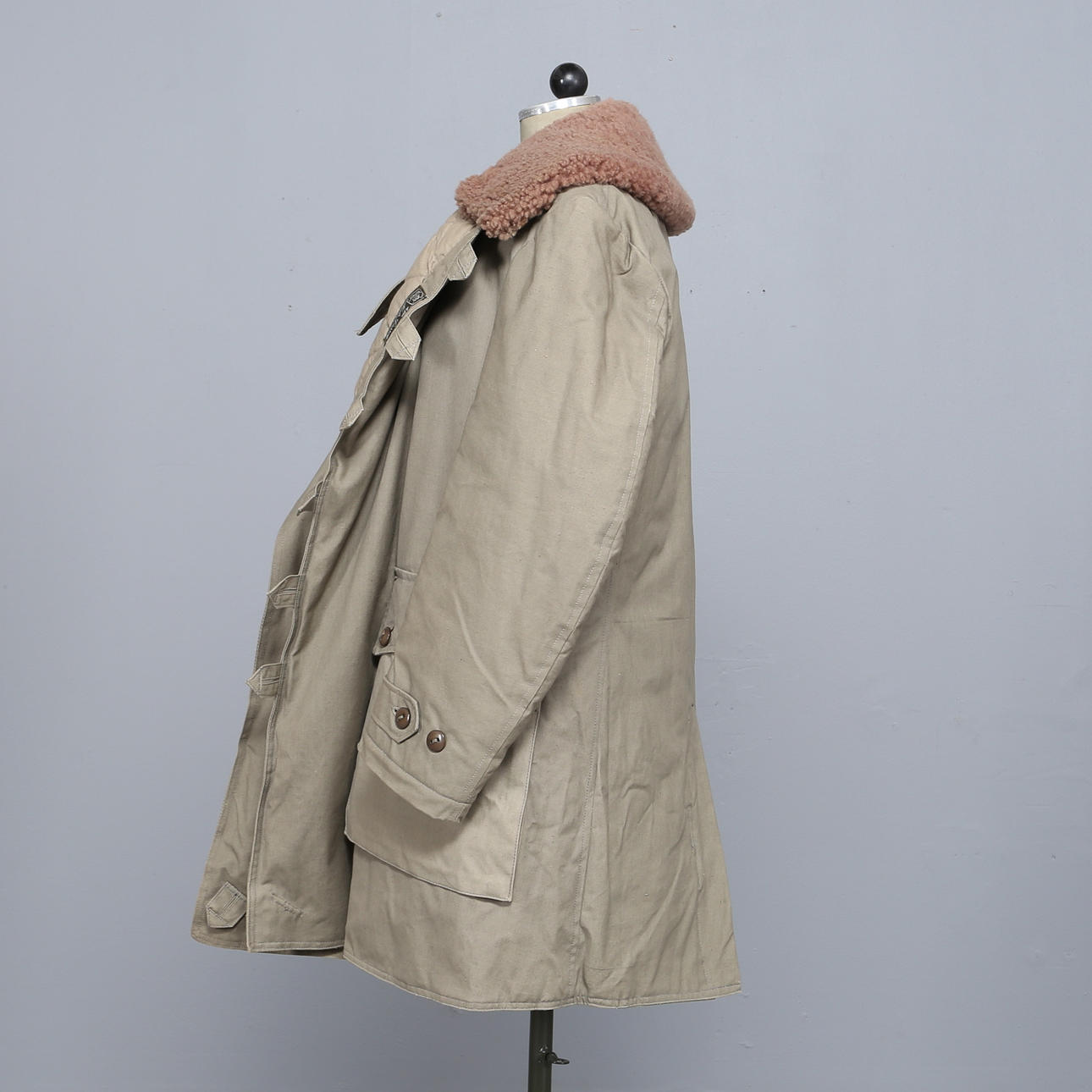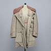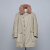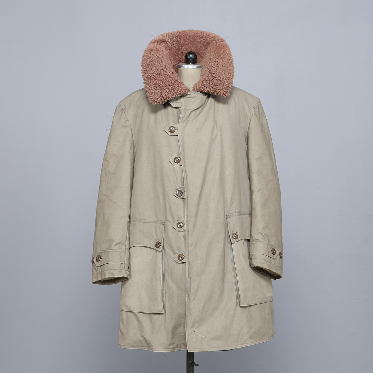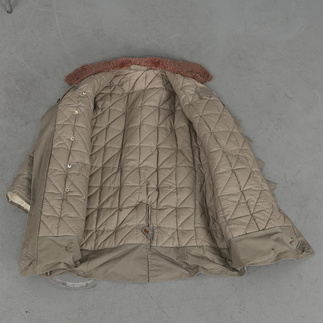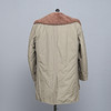 Army coat in heavily lined green textile, sheepskin collar, button fastening, external pockets, measurements: back length 100 cm, sleeve length 66 cm, chest circumference measured under the arms approx. 120 cm.
