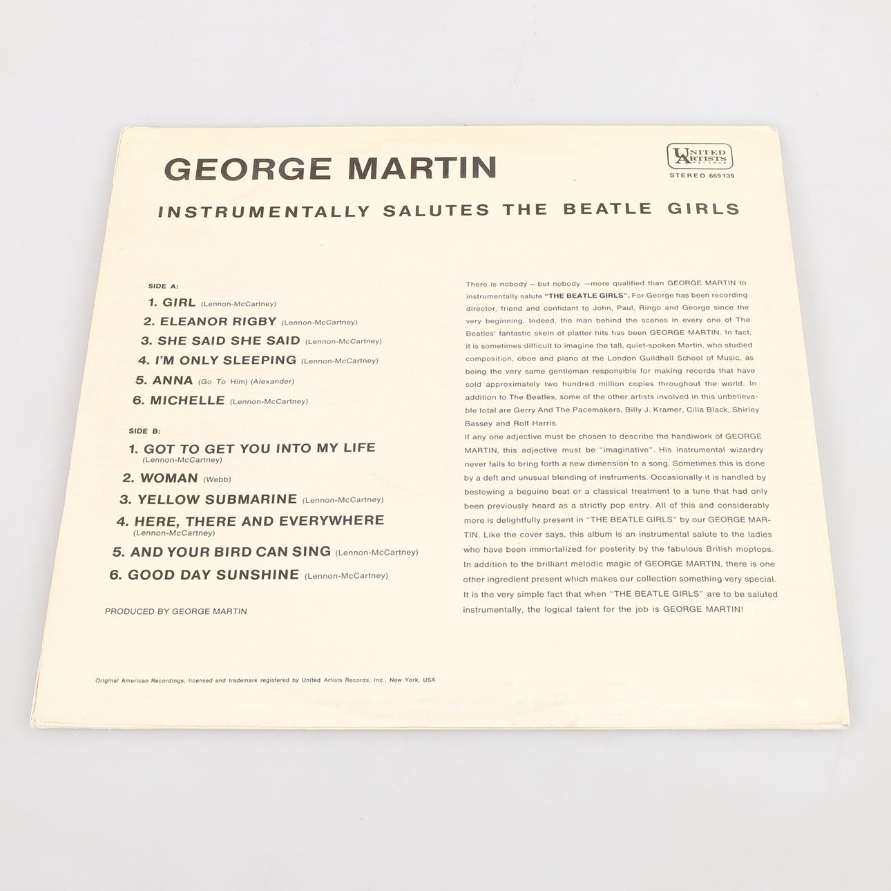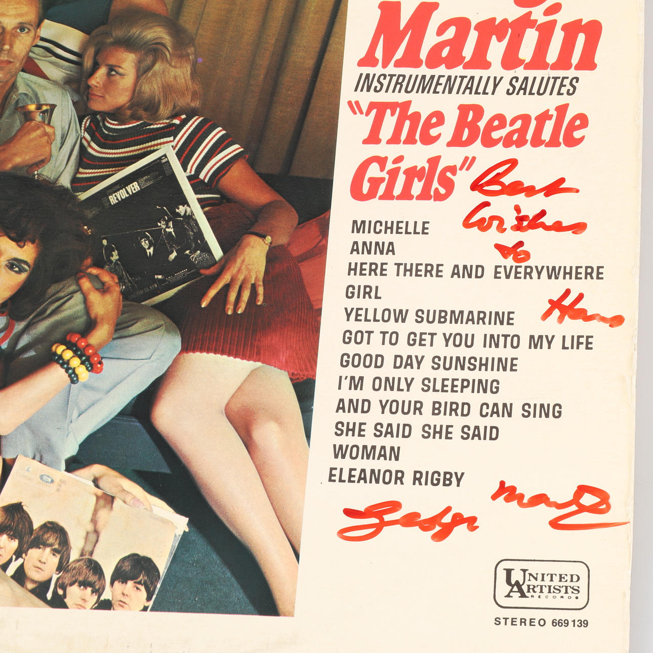 LP signed by George Martin, "the fifth member of the Beatles". George Martin, Instrumentally Salutes "The Beatles Girls", 669 139, United Artists.
