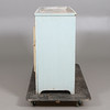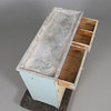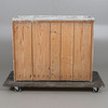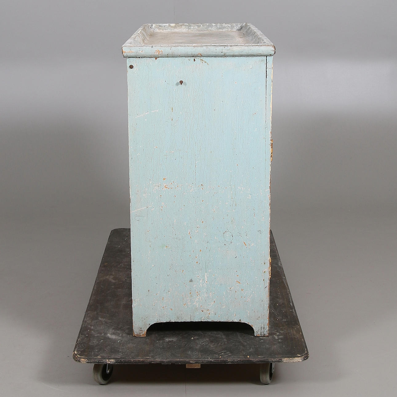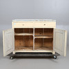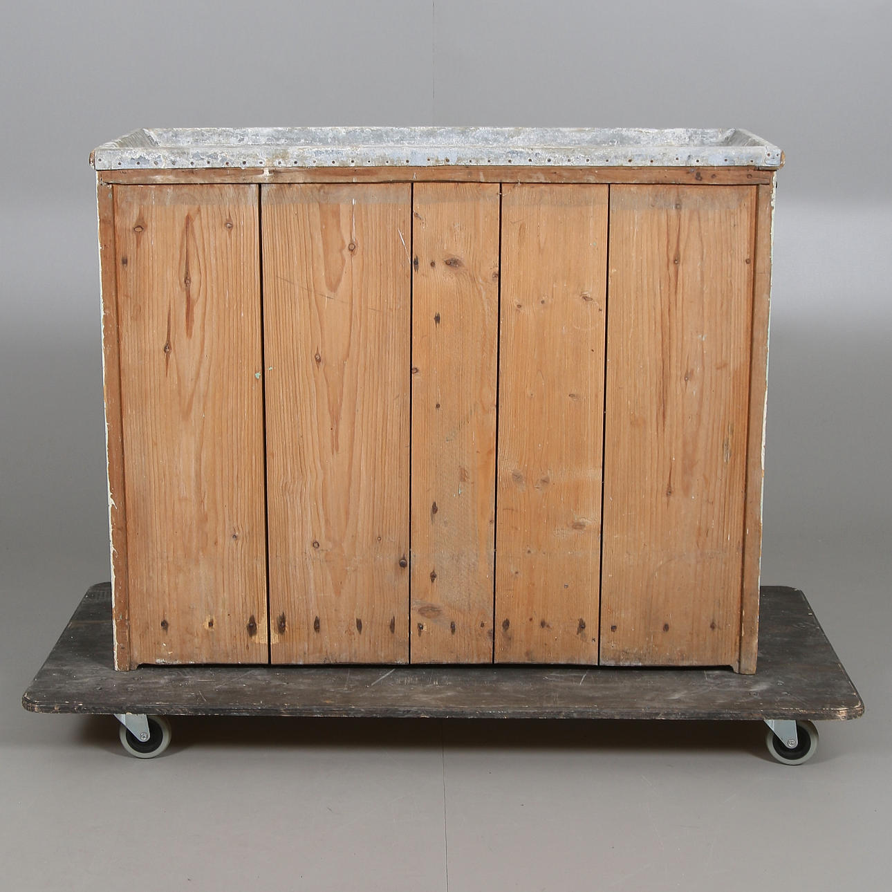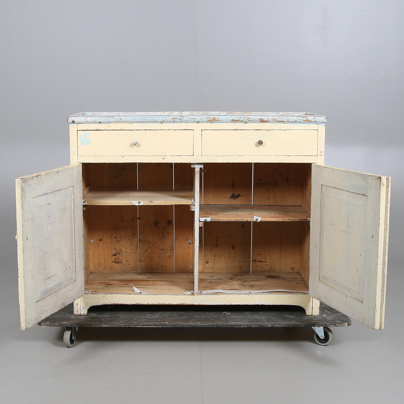 Painted pine. Worktop covered with zinc sheet. Front with two drawers and double doors with storage behind. Length approx. 96, width 38, height 77 cm.