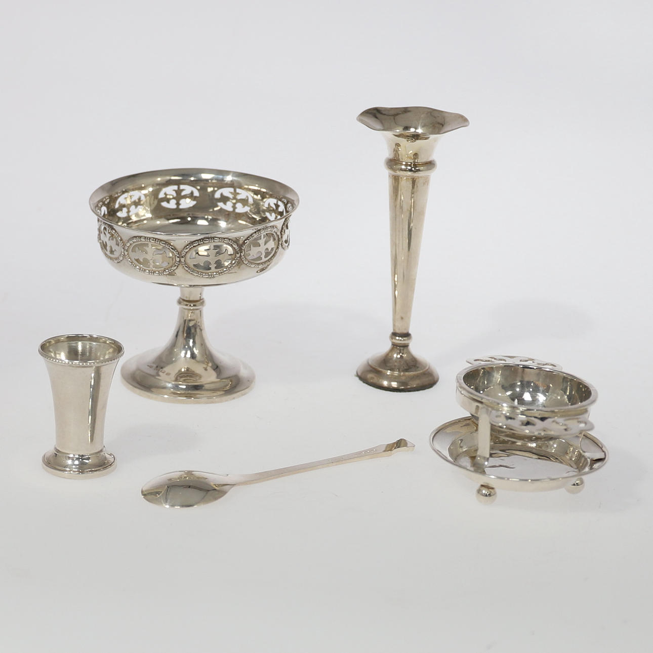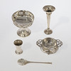 a small pedestal dish, with pierced oval panel decoration, by Hukin & Heath, hallmarked Birmingham 1913, 9.5cm diameter, a spill vase on weighted base, hallmarked Birmingham 1919, 14cm high,