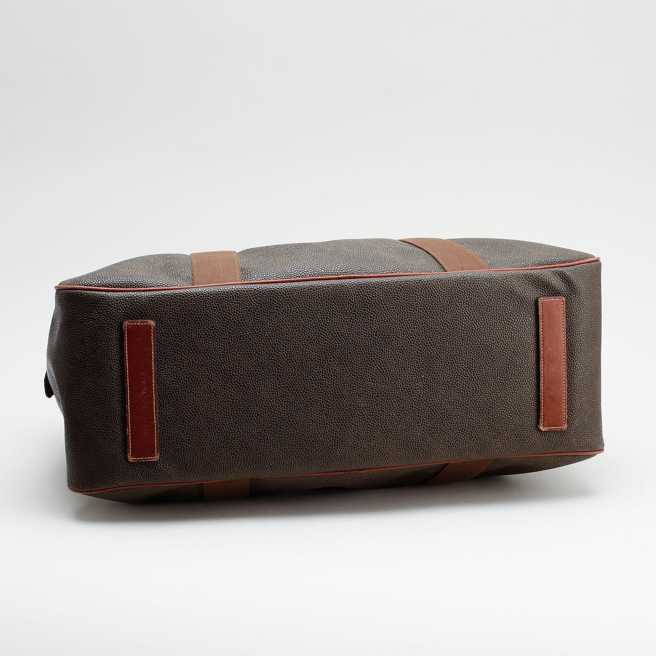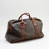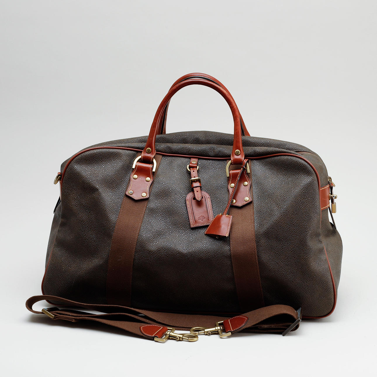 Green scotch grain with details in brown leather and brass. Detachable shoulder strap. Address tag in leather. Inner lining in black textile. A smaller zippered compartment Labeled "MULBERRY". Dimensions approx. 46 x 33 x 20 cm.