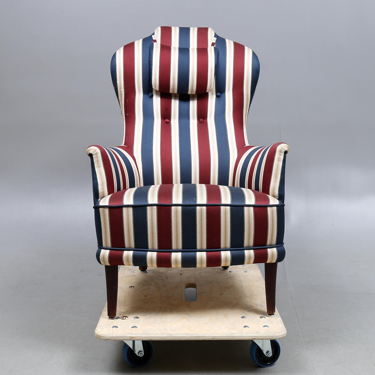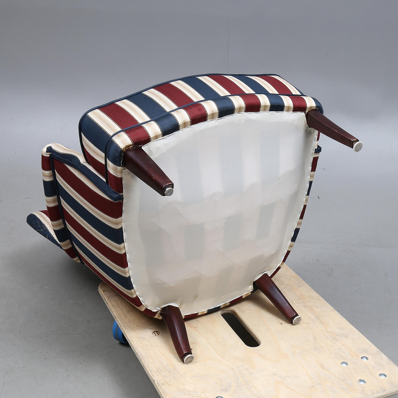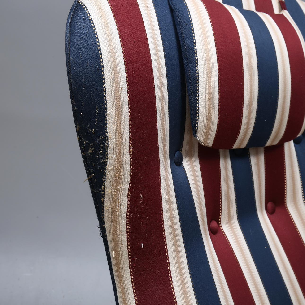 Wear. Stains. Later upholstery, damaged in places. Label plate is missing.