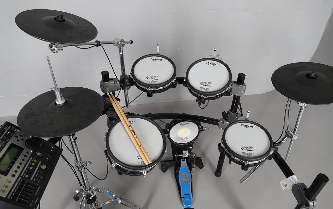 complete with a Roland personal monitor PM-10, stool, pedal, one cable, some owner´s manuals and one pair of used drumsticks.