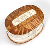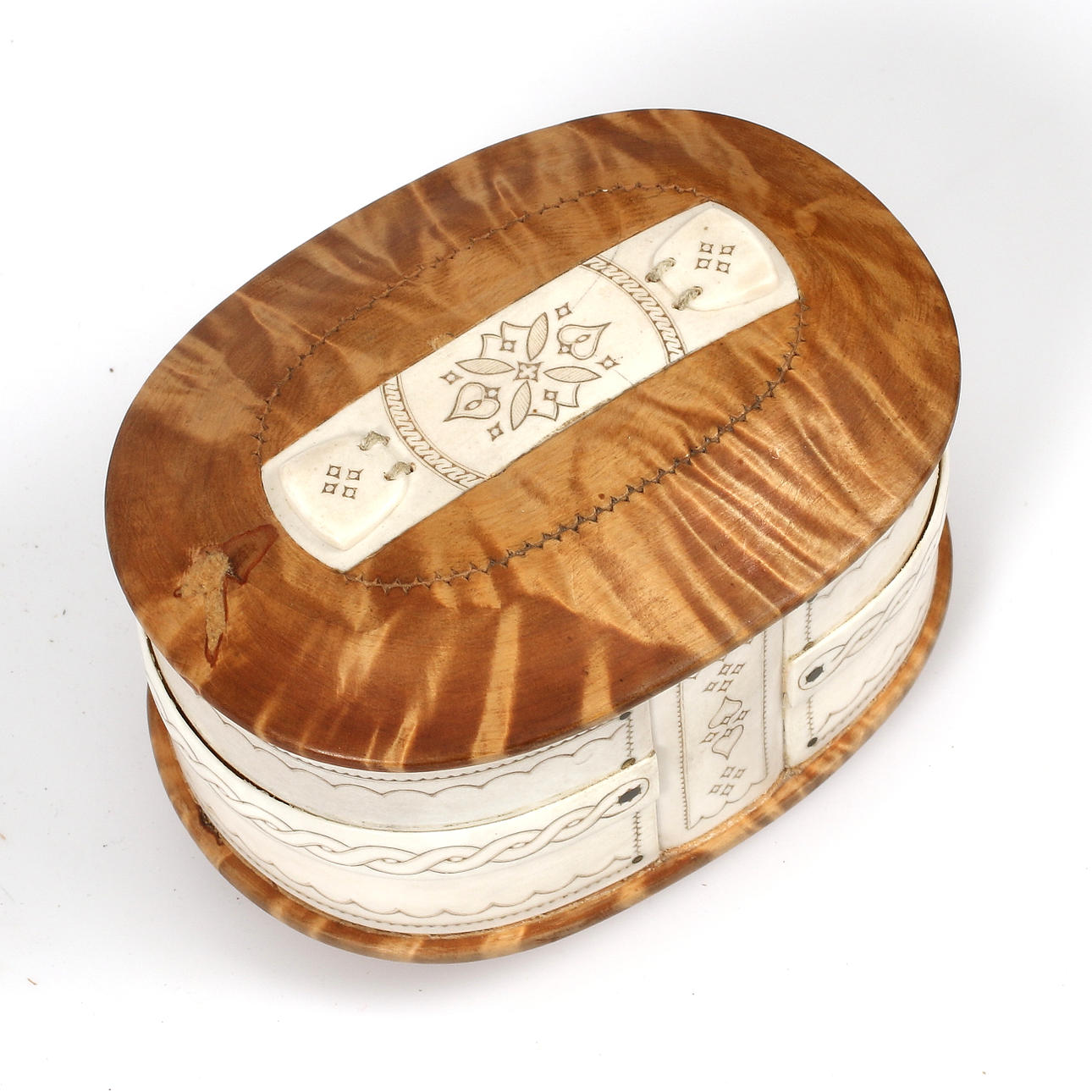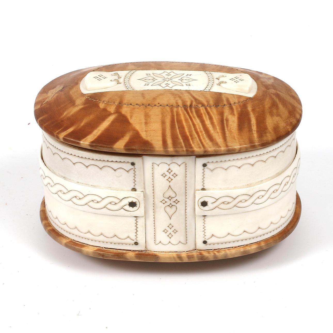 Made of birch. Sweeping and inset in the lid of horn with engraved decoration. Length approx. 13.5, width 10, height 8.5 cm.