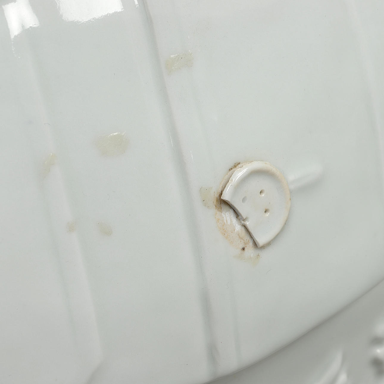 Third button damaged, part missing, minor stains, possibly two buttons with repair.