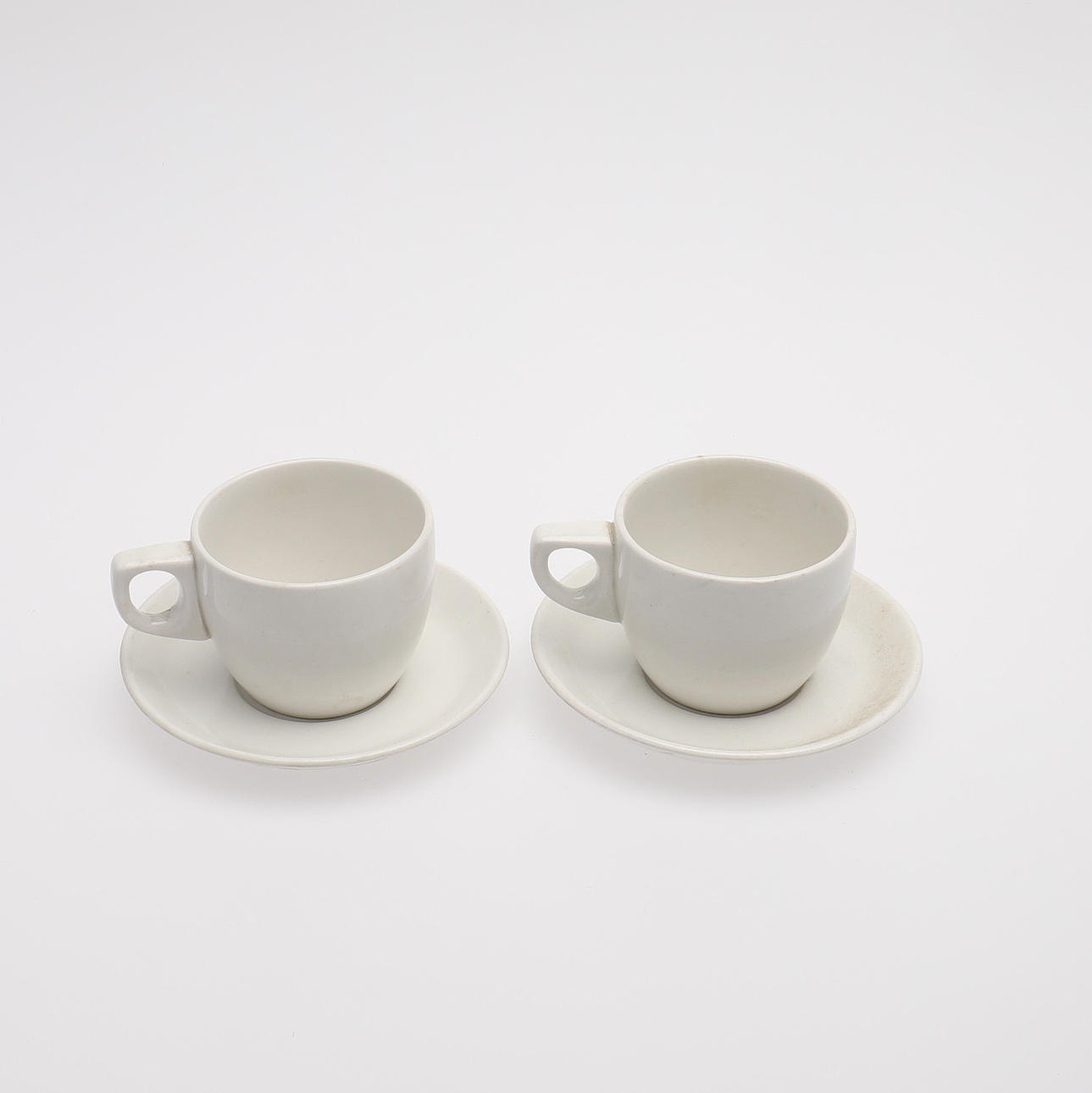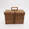 Teapot with rechaud and accompanying fuel bottle, match case, metal box, milk bottle, 2 cups with saucer, and 2 teaspoons. Wicker willow basket bag.