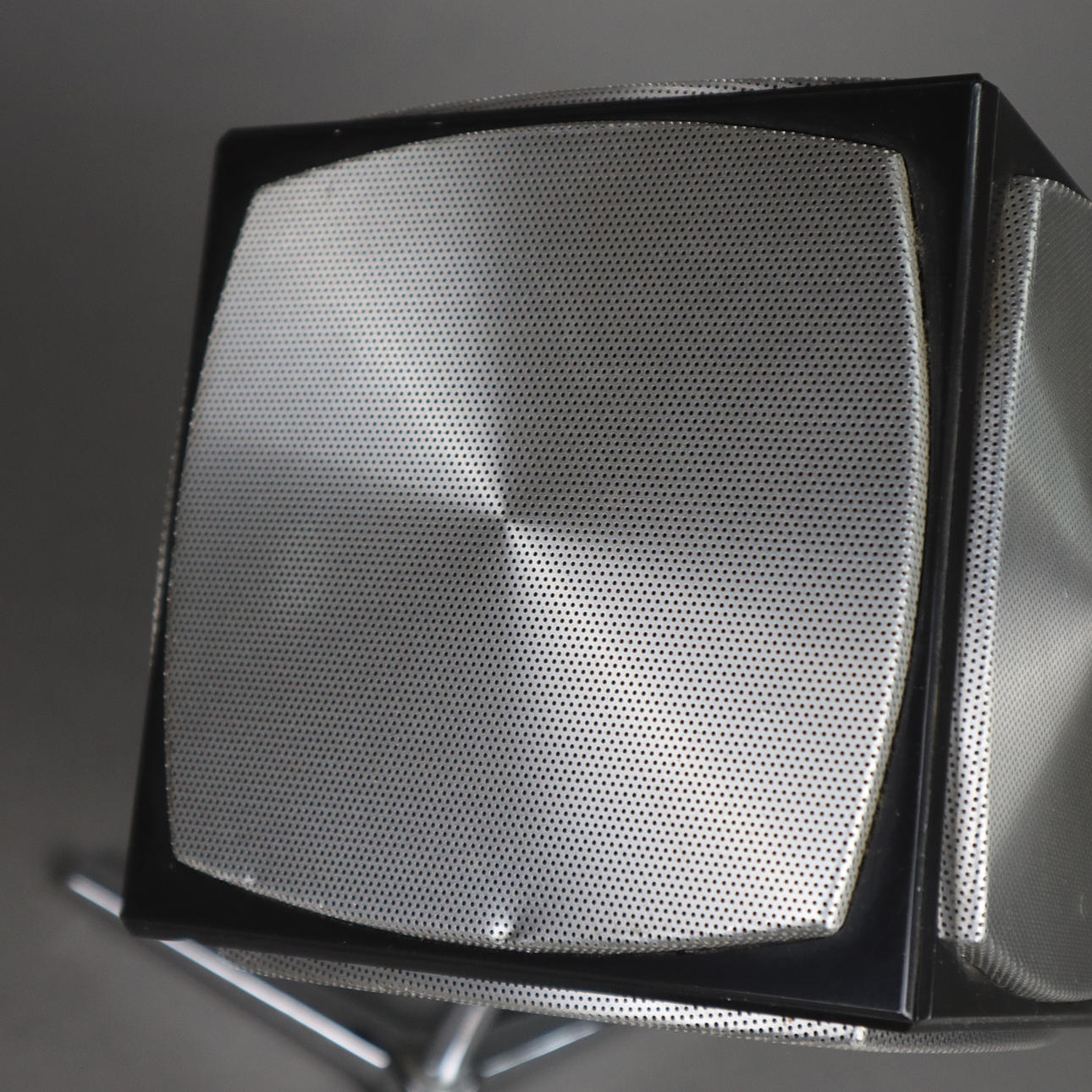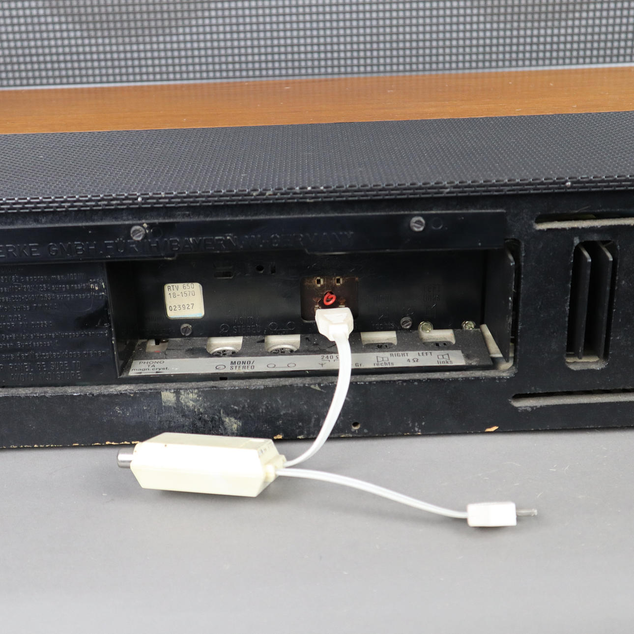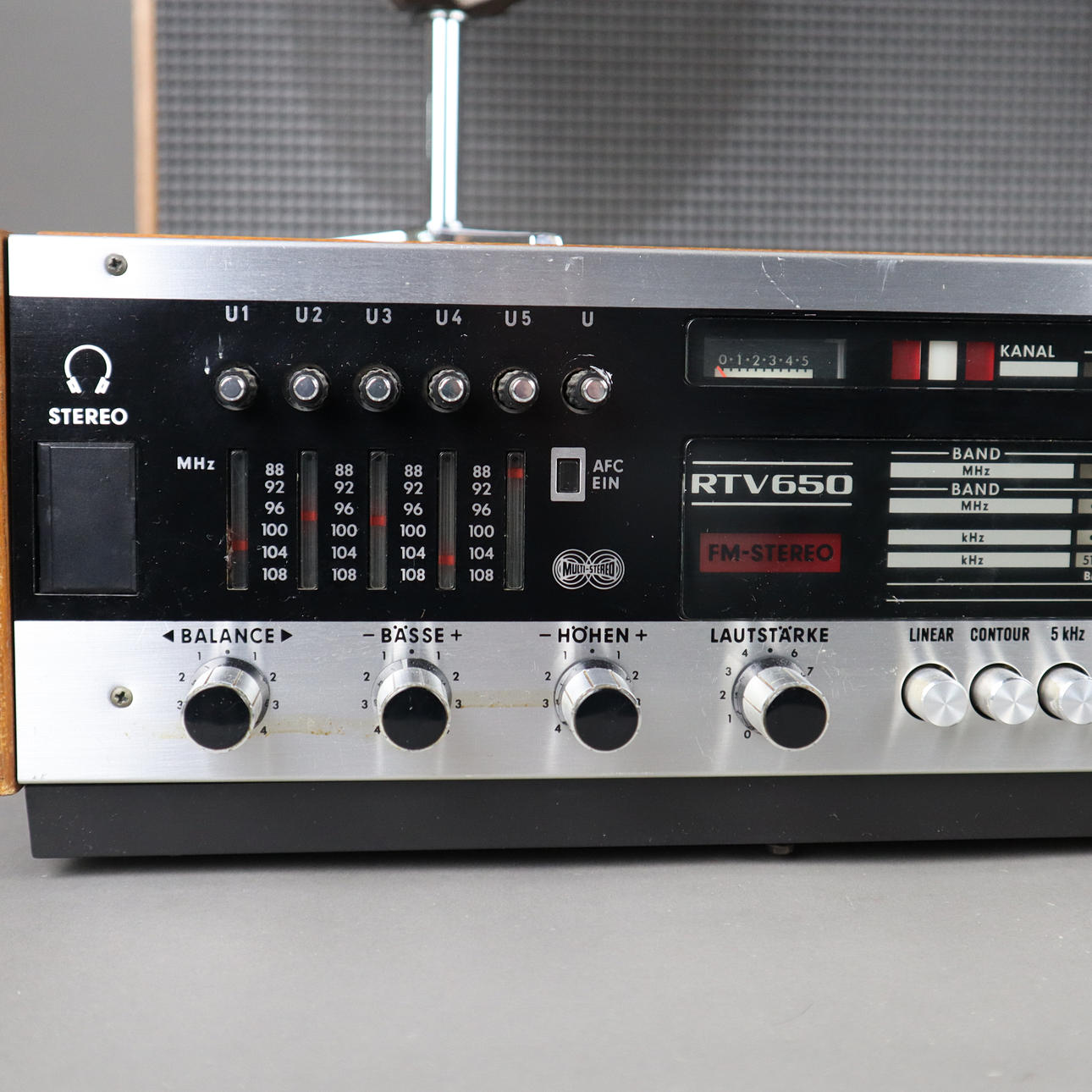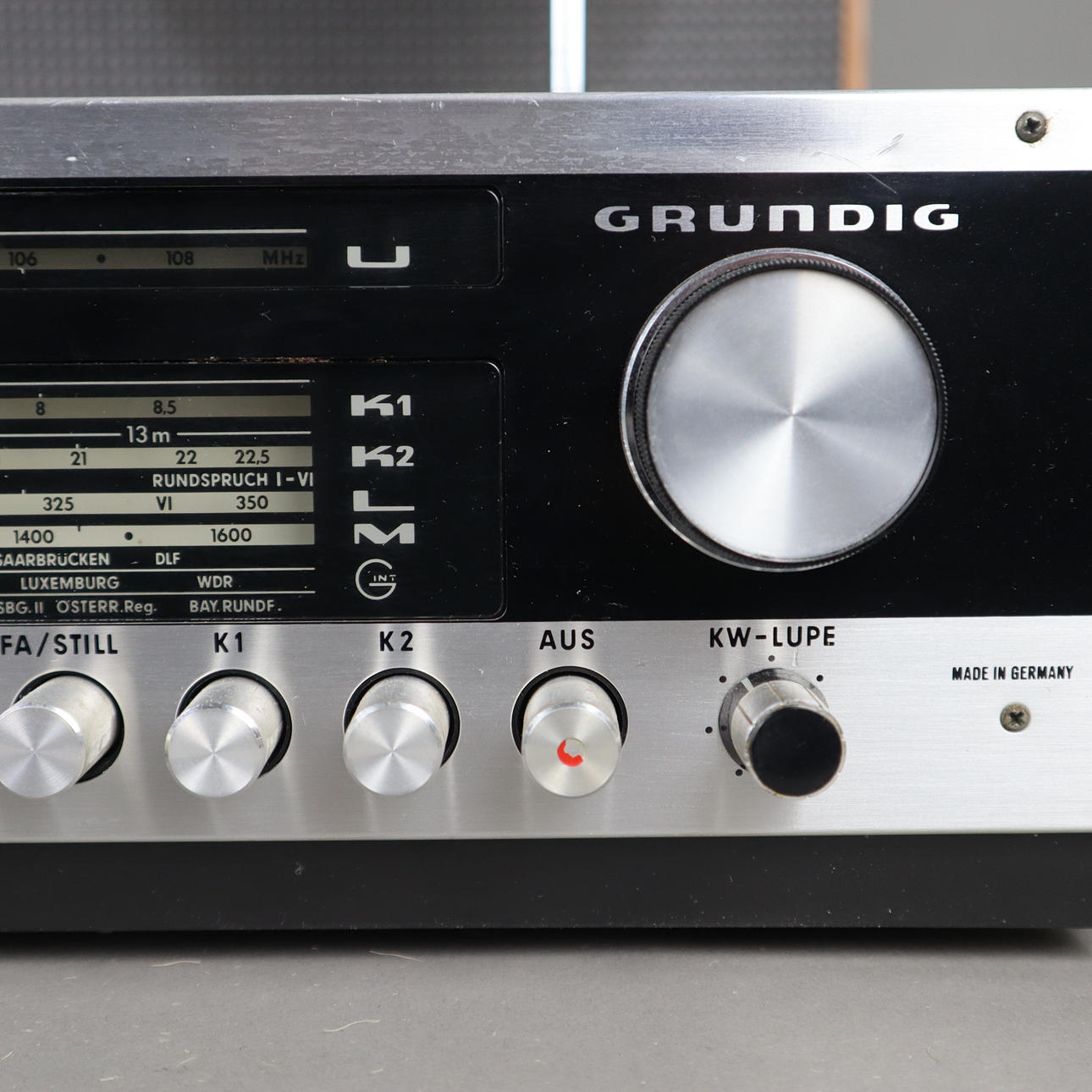 Consisting of: 1 hi-fi tuner amplifier, Grundig RTV 650 1 hi-fi duo bass box 401, Grundig 2 hi-fi spherical radiators, cube boxes on a tripod base Operating instructions attached.