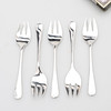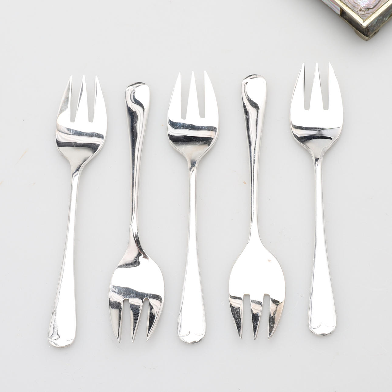 A set of five silver plated oyster forks and two bulldog desk clips, the first a Myers No. 3411 1930s Lion Head desk clip, 5cm x 7.5cm, the other a Boston Clip No.1, by Hunt MFG Co. Statesville N.C. modelled as a frog, 5cm x 5cm.