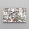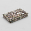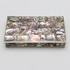 The exterior decorated in panels of abalone, the folding lid enclosing a hardwood recess, stamped Hechden Mexico Alpaca to base, 2cm high x 14cm wide x 8cm deep.