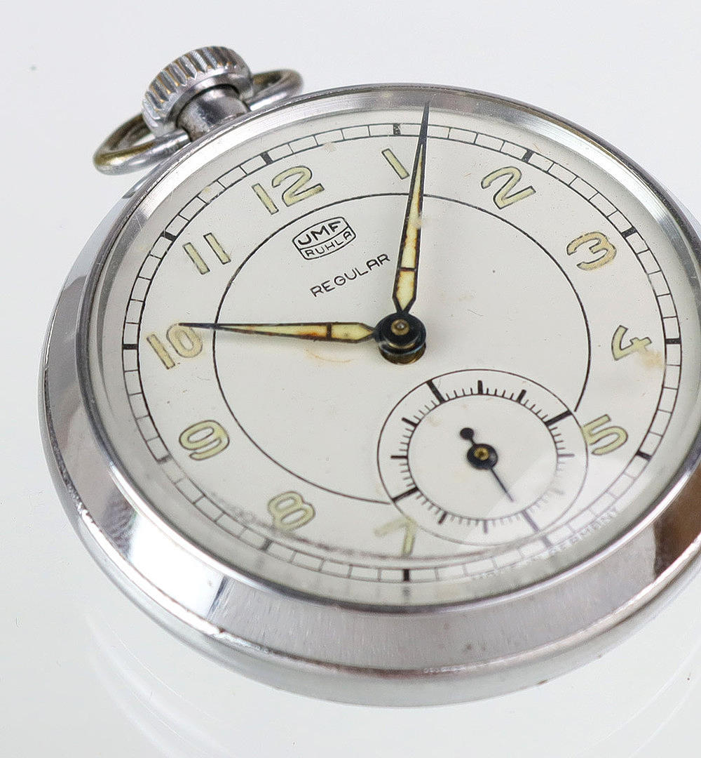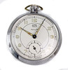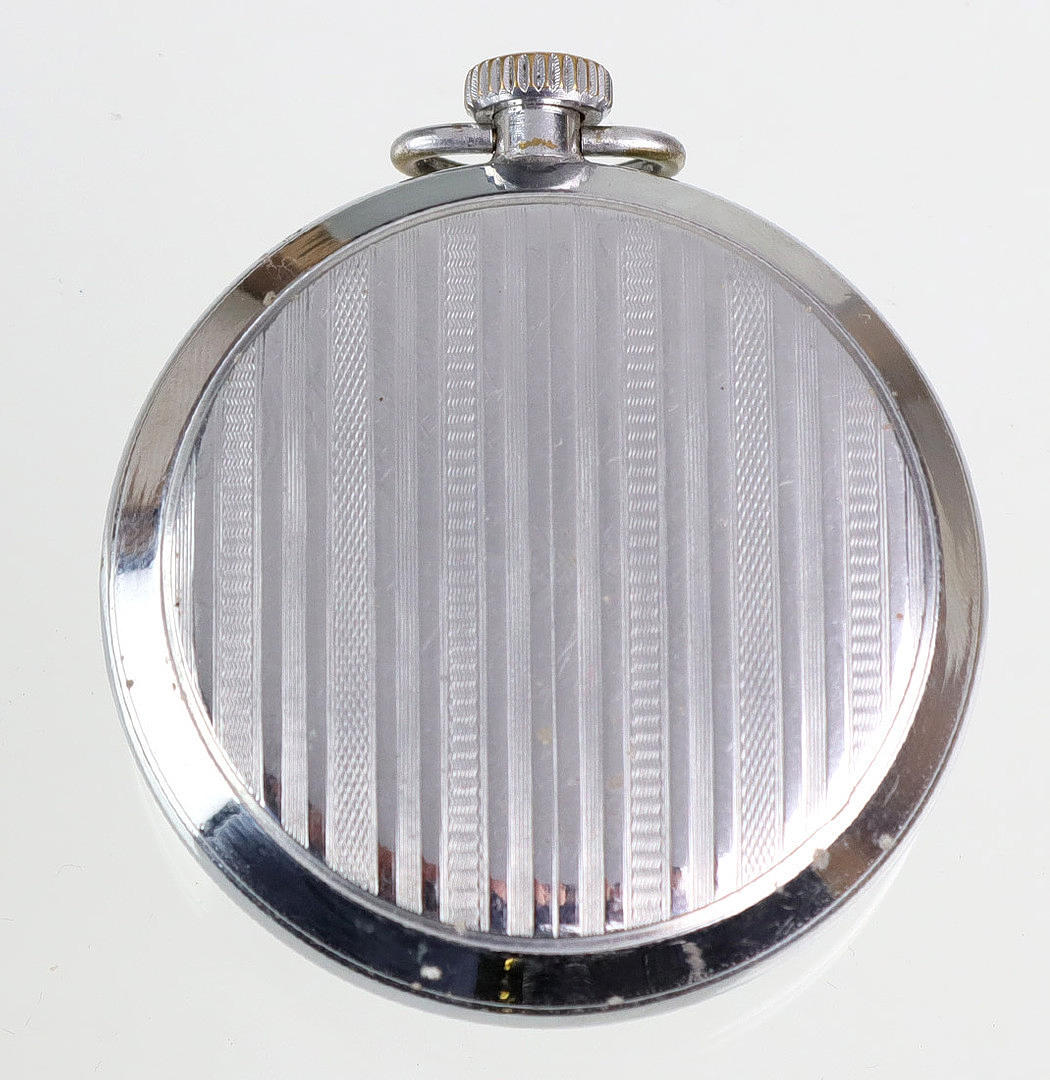 Mechanical pocket watch from Ruhla, chrome housing, seconds at 6 o'clock, with luminous hands at night, Ø approx. 5 cm.