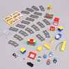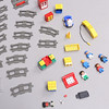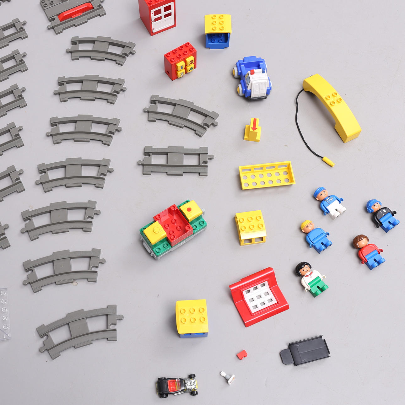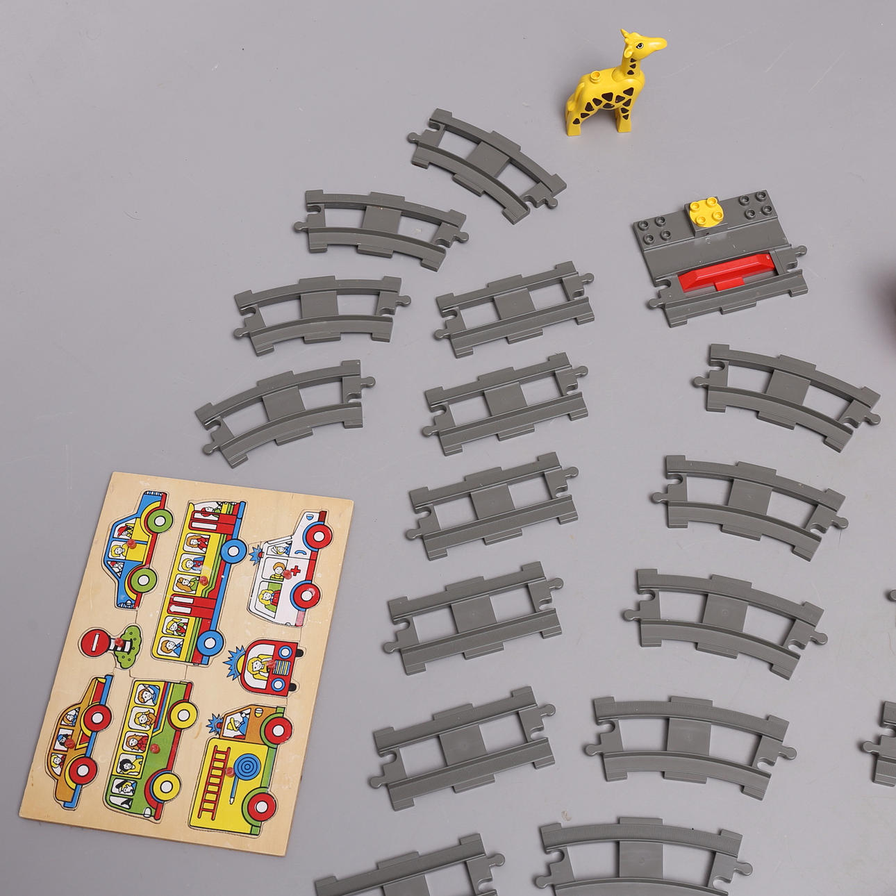Duplo train track, with battery-powered locomotive. Puzzle with buttons.