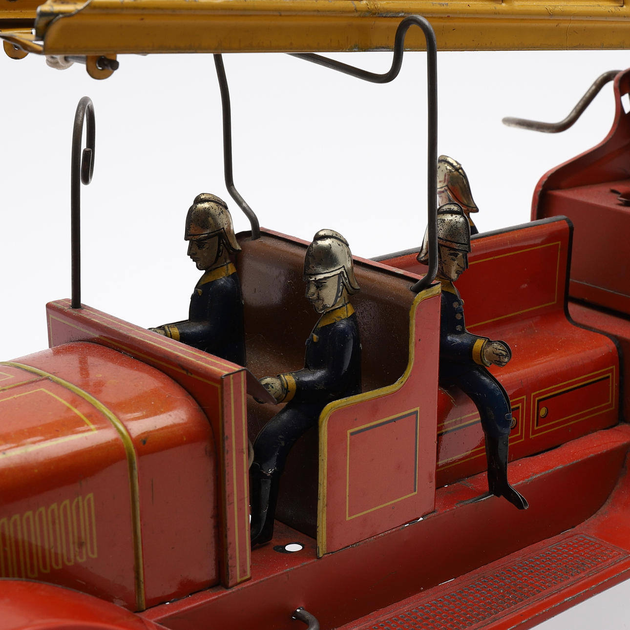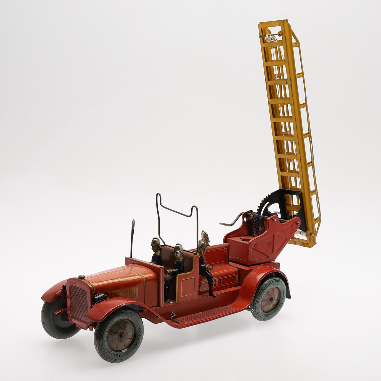 Lithographed plate. 4 sitting firefighters, two-part adjustable ladder. Battery-powered lighting (defective). Length 47 cm.