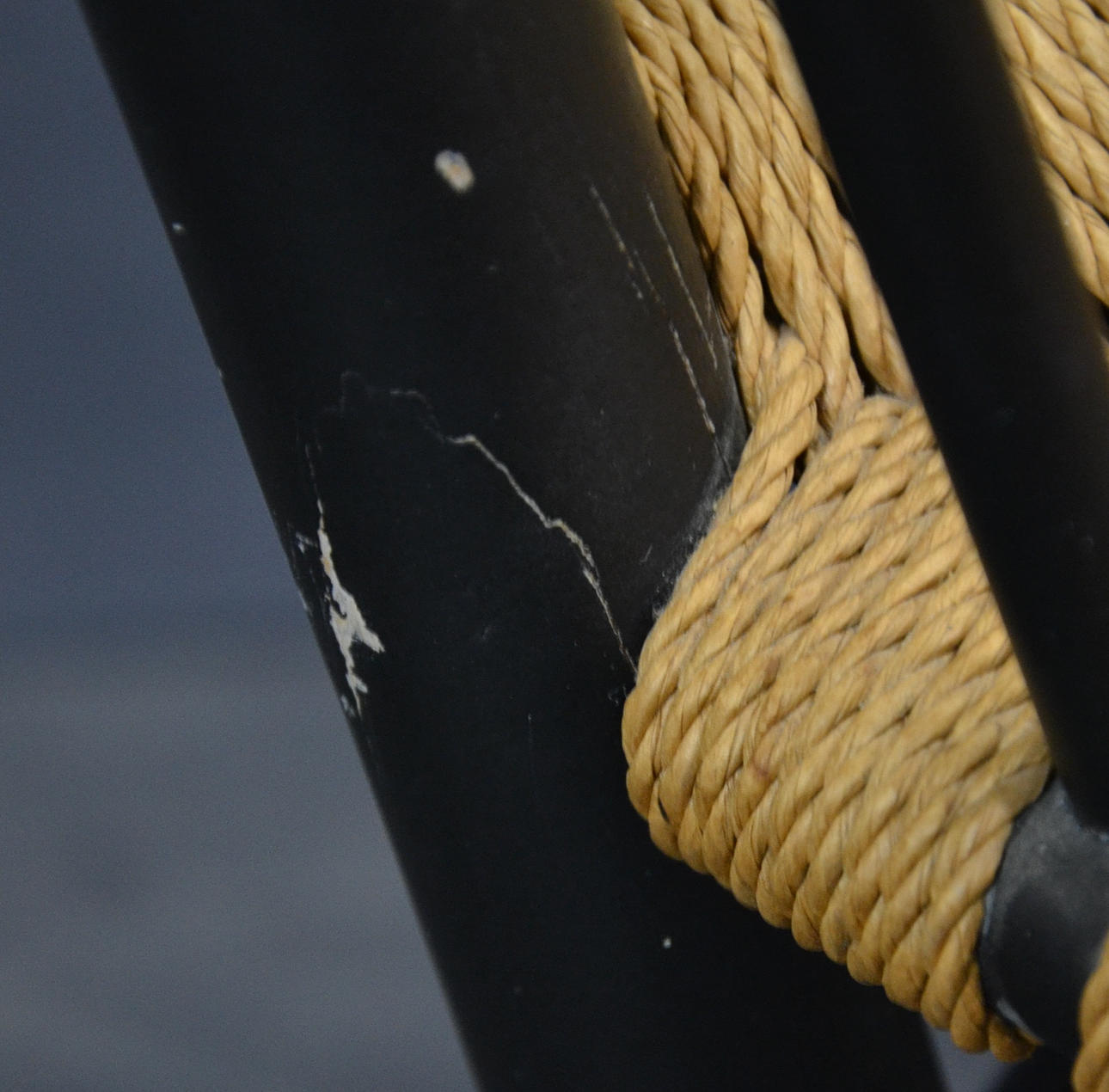 Glued defect on the rear left leg, as well as slight cracks on the left leg in the area of the seat.
