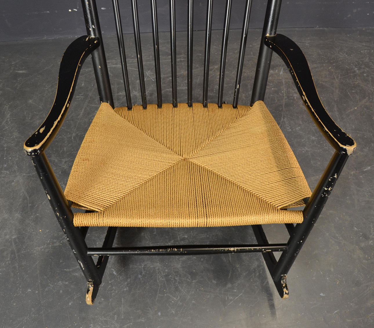 Design Hans J. Wegner 1944 Produced by FDB Model J-16 Wood painted black, seat with woven paper cord.