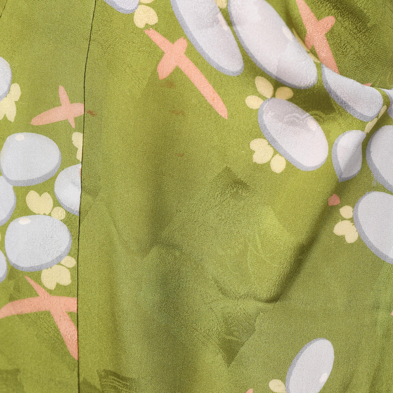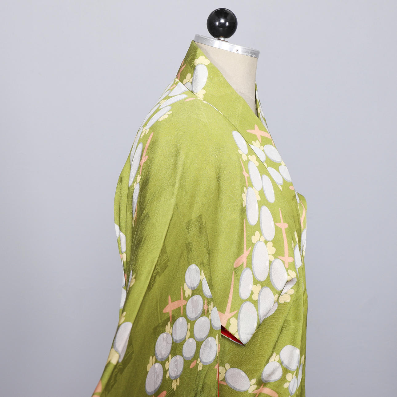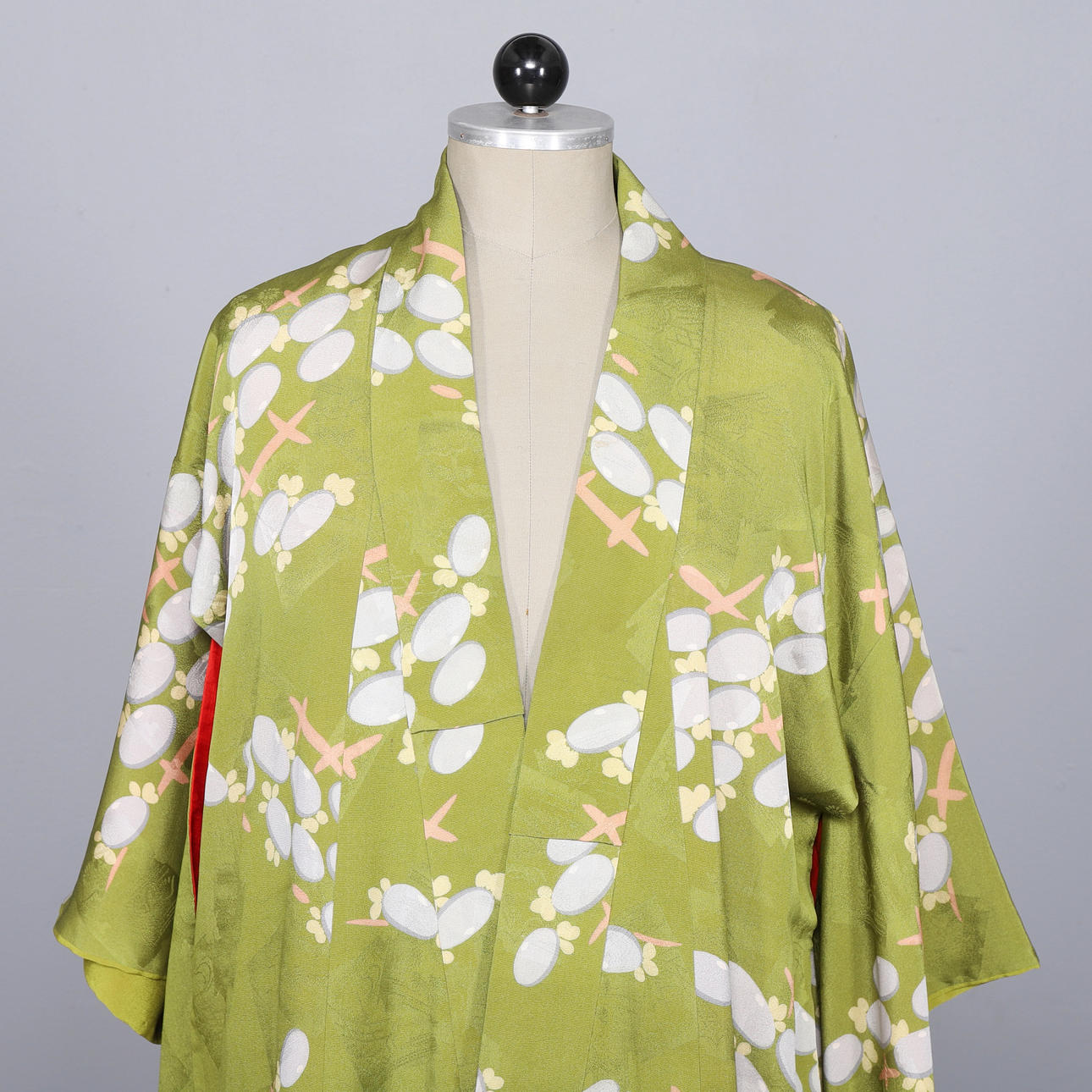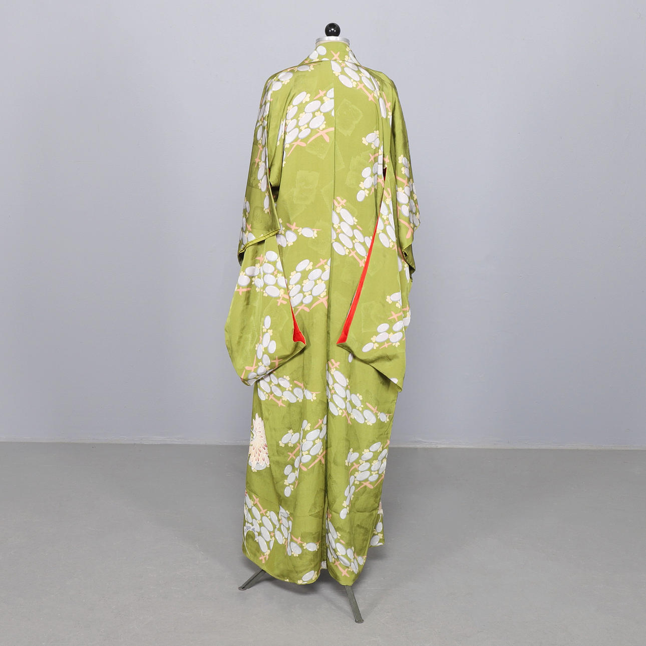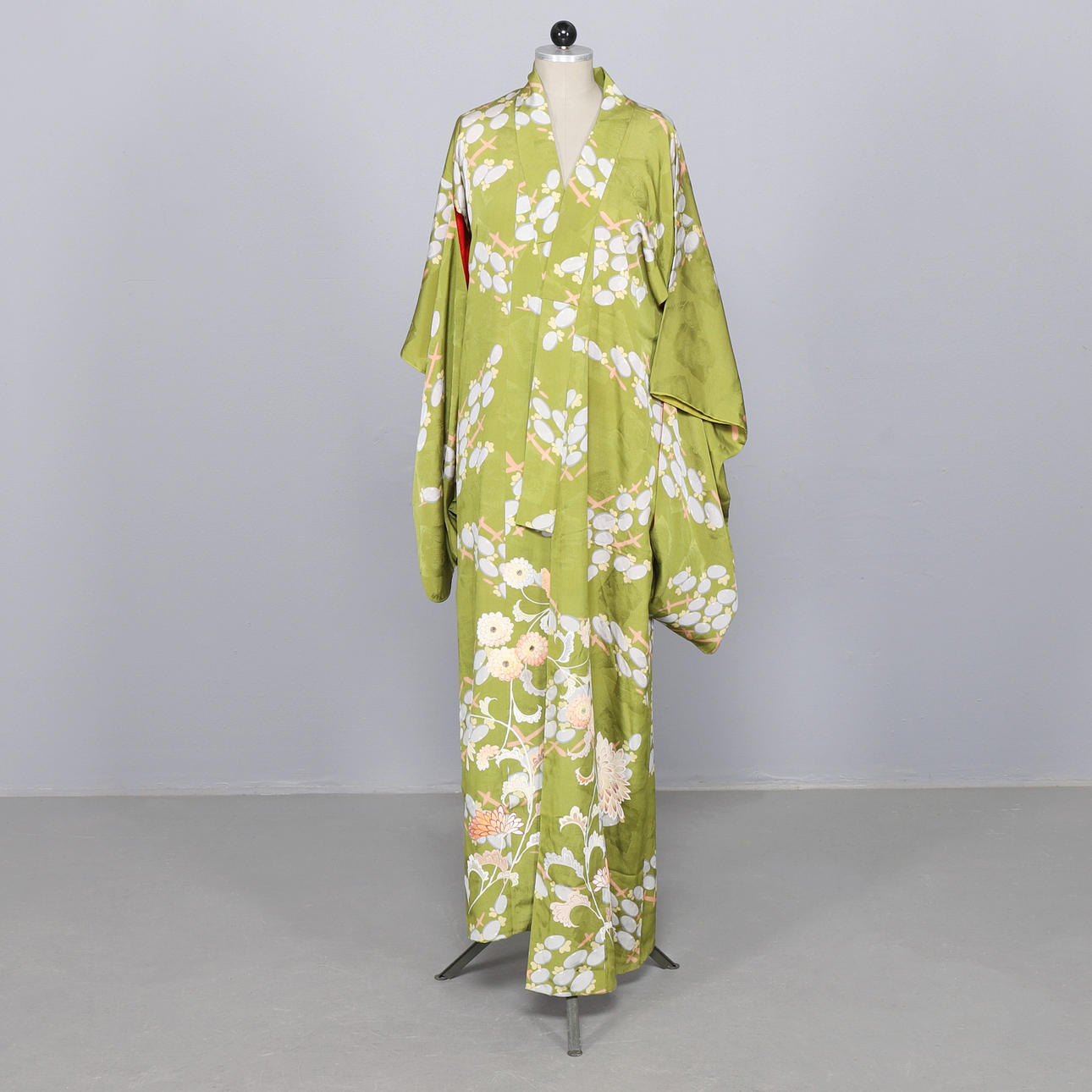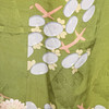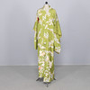 Japanese yukata all in silk. Pattern with peonies on a green background.