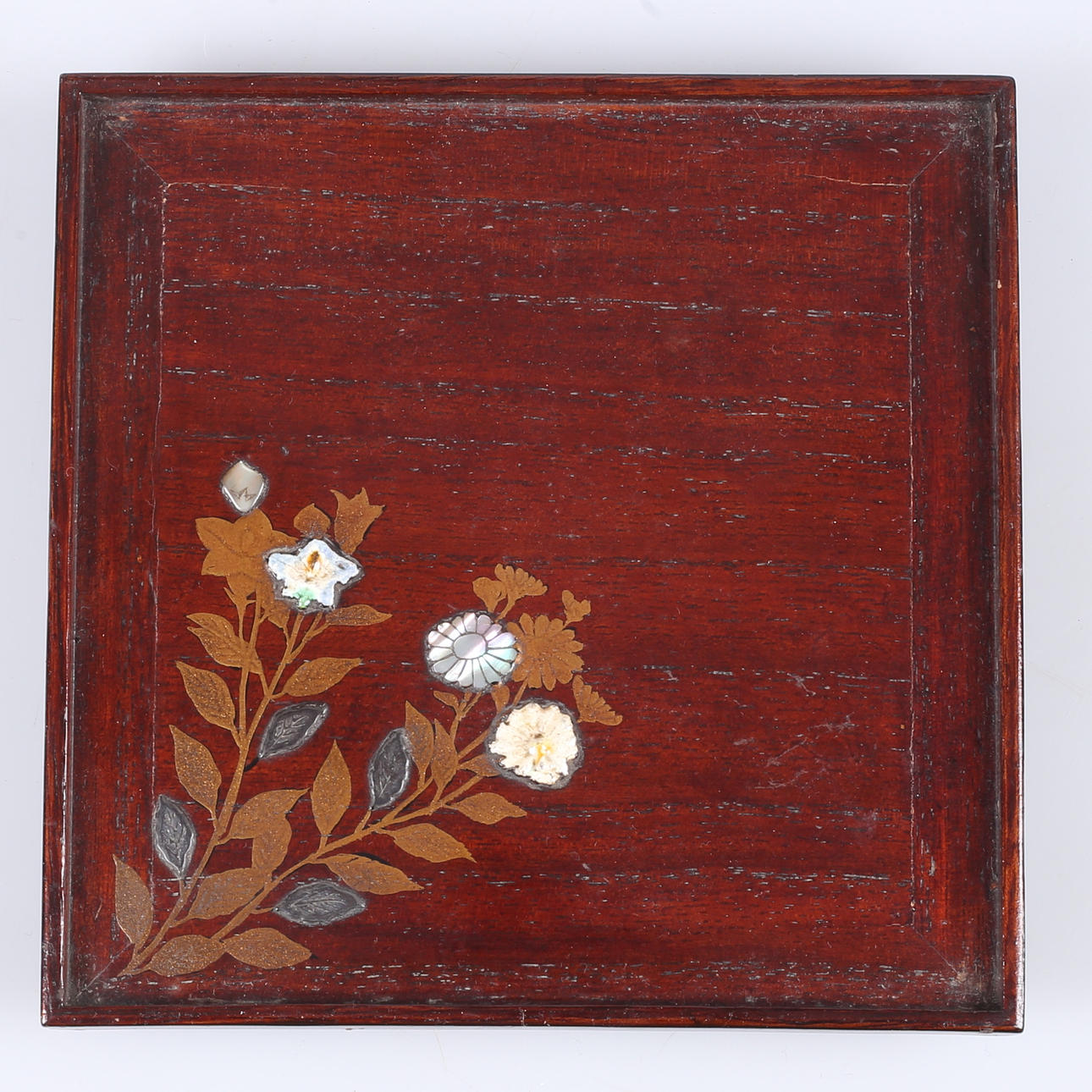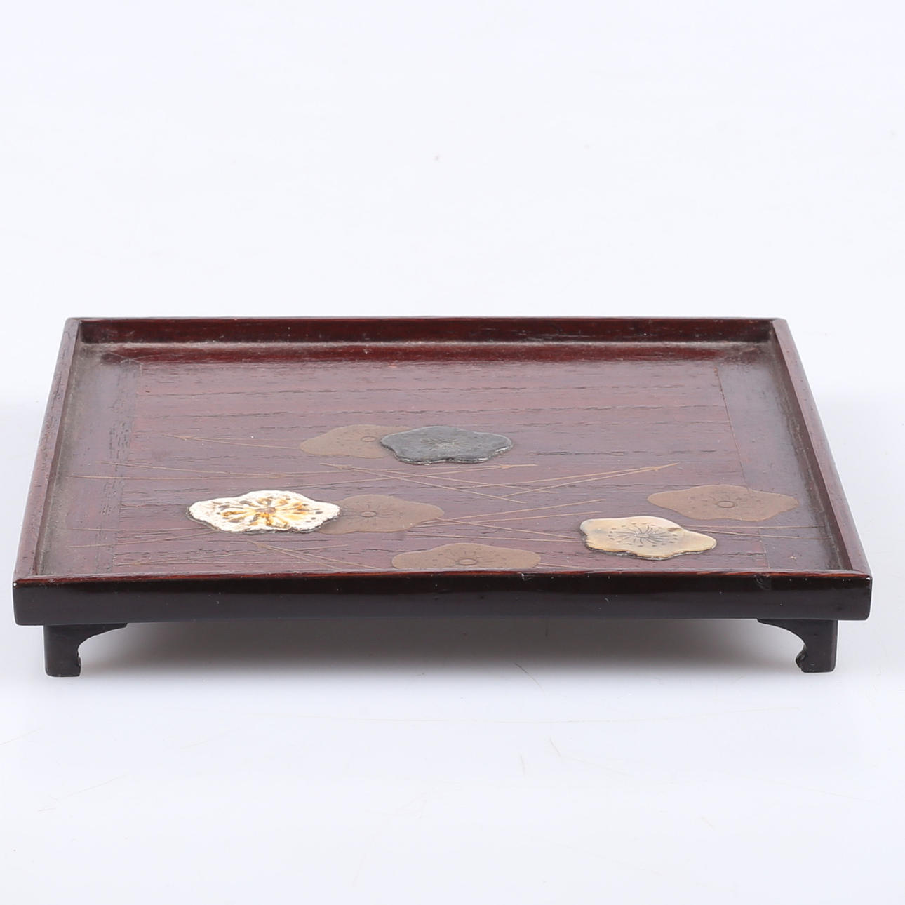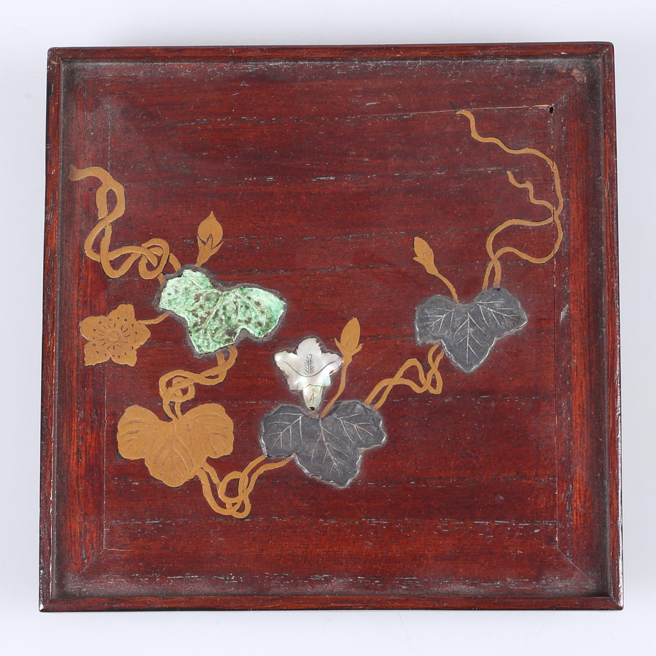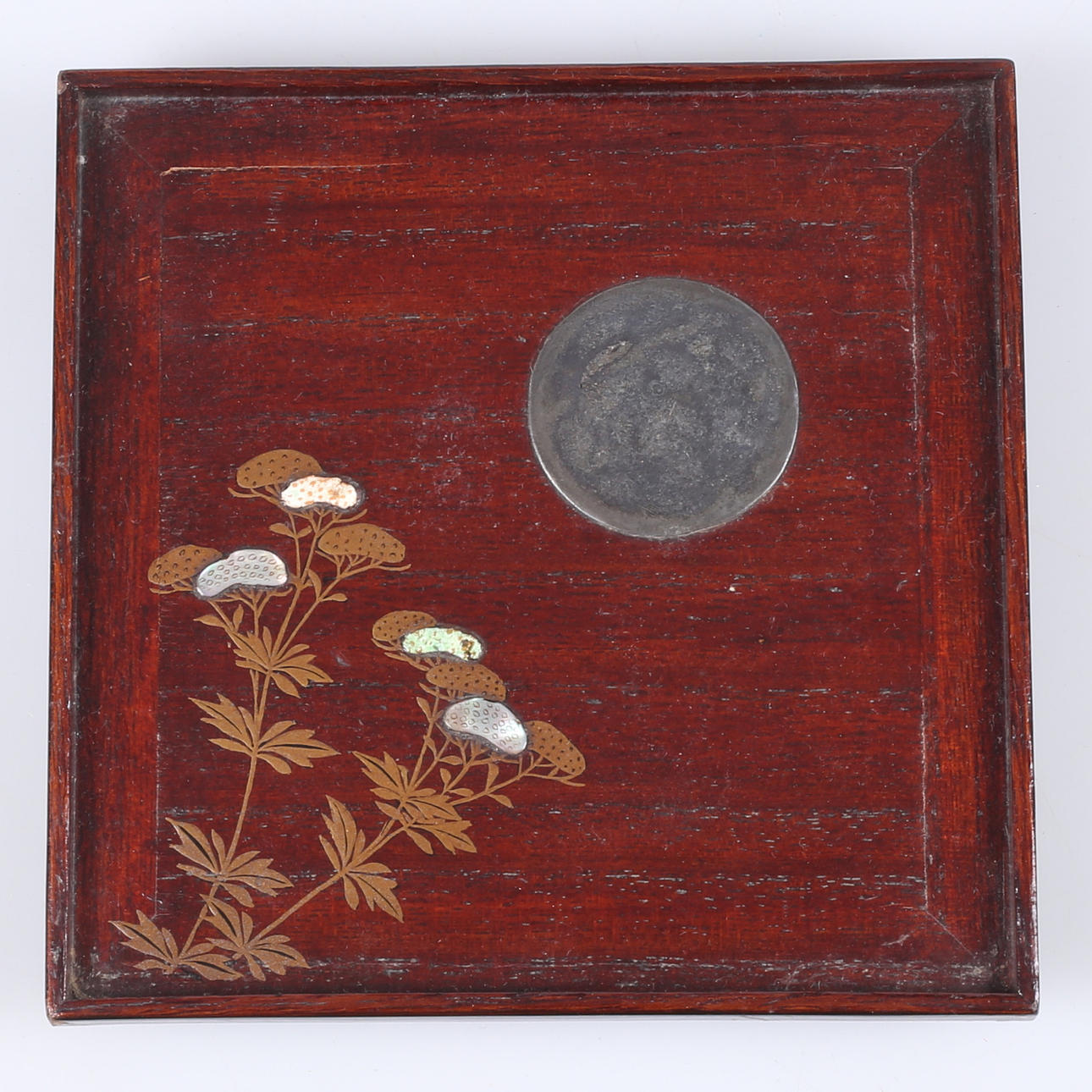 Lacquer works skmaki-e work with decor of e.g. a. mother of pearl and metal. Dimensions 13.7x13.7 cm.