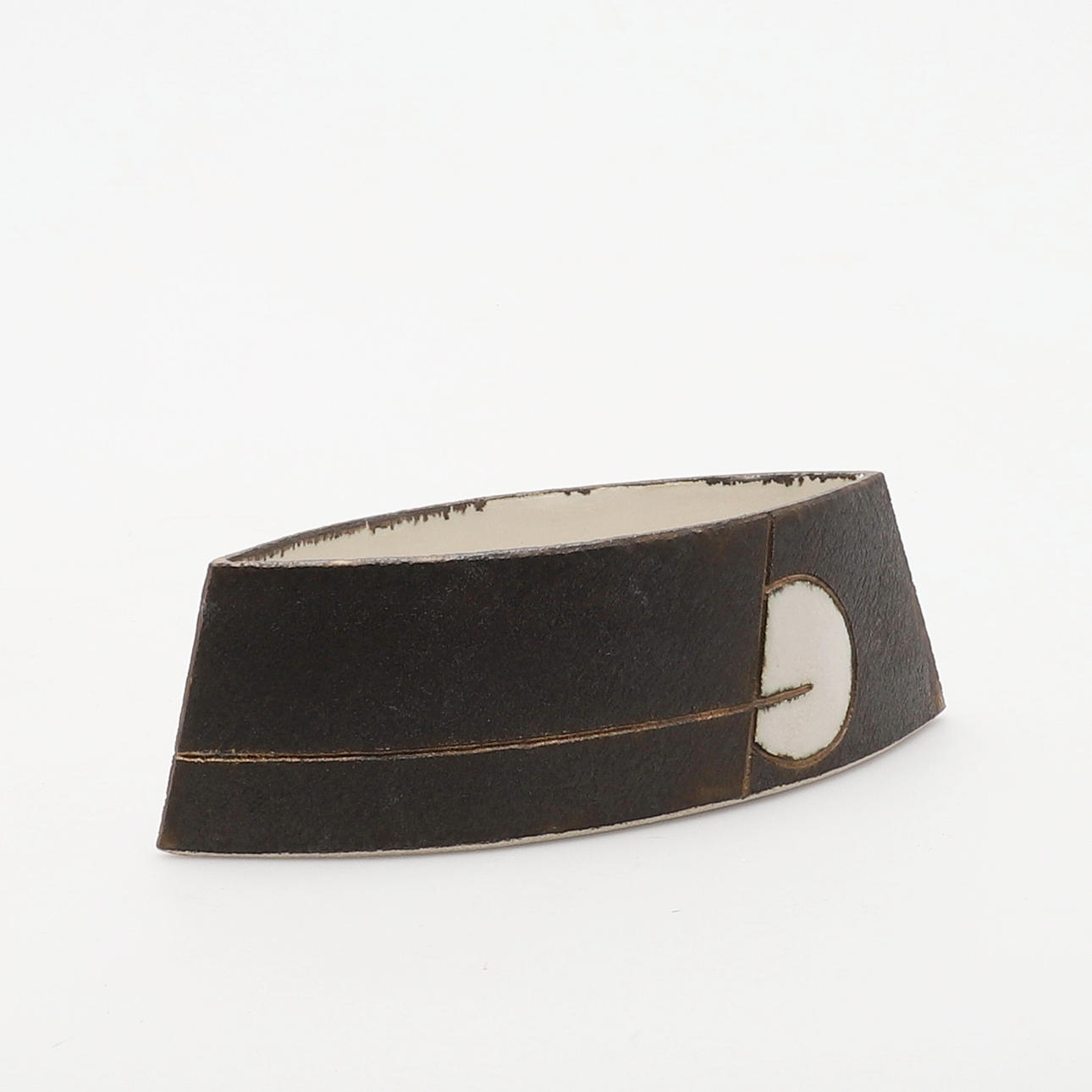 of ways. I work with a variety of coarse stoneware bodies to produce sharply defined, often symmetrical vessels with scraped and stained surfaces. A series often develops through the systematic reworking of a particular form before that is, sometimes temporarily, exhausted.