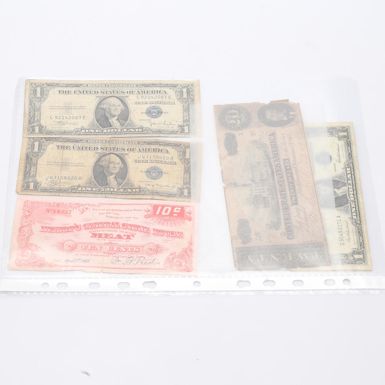 Including silver coins. One dollar, 1922 and more. Banknotes, including Bishops General Storehouse, Salt Lake, Utah 1898. Twenty dollars 1864.