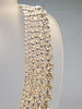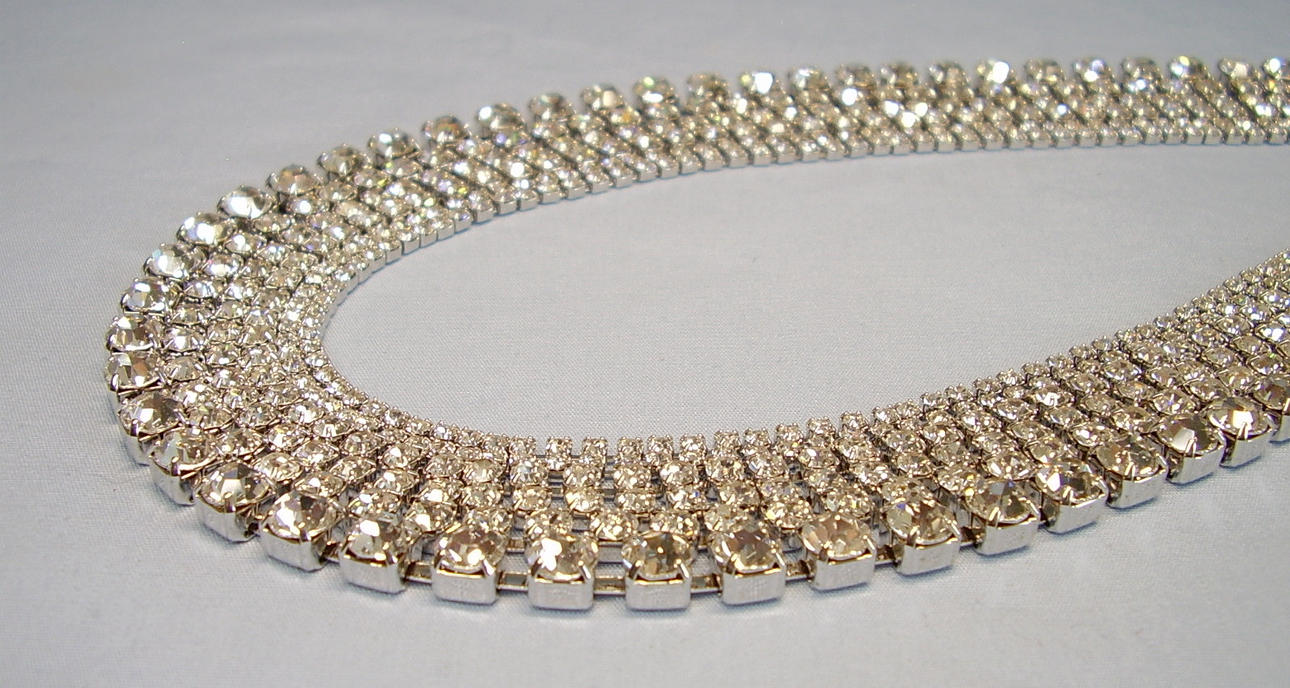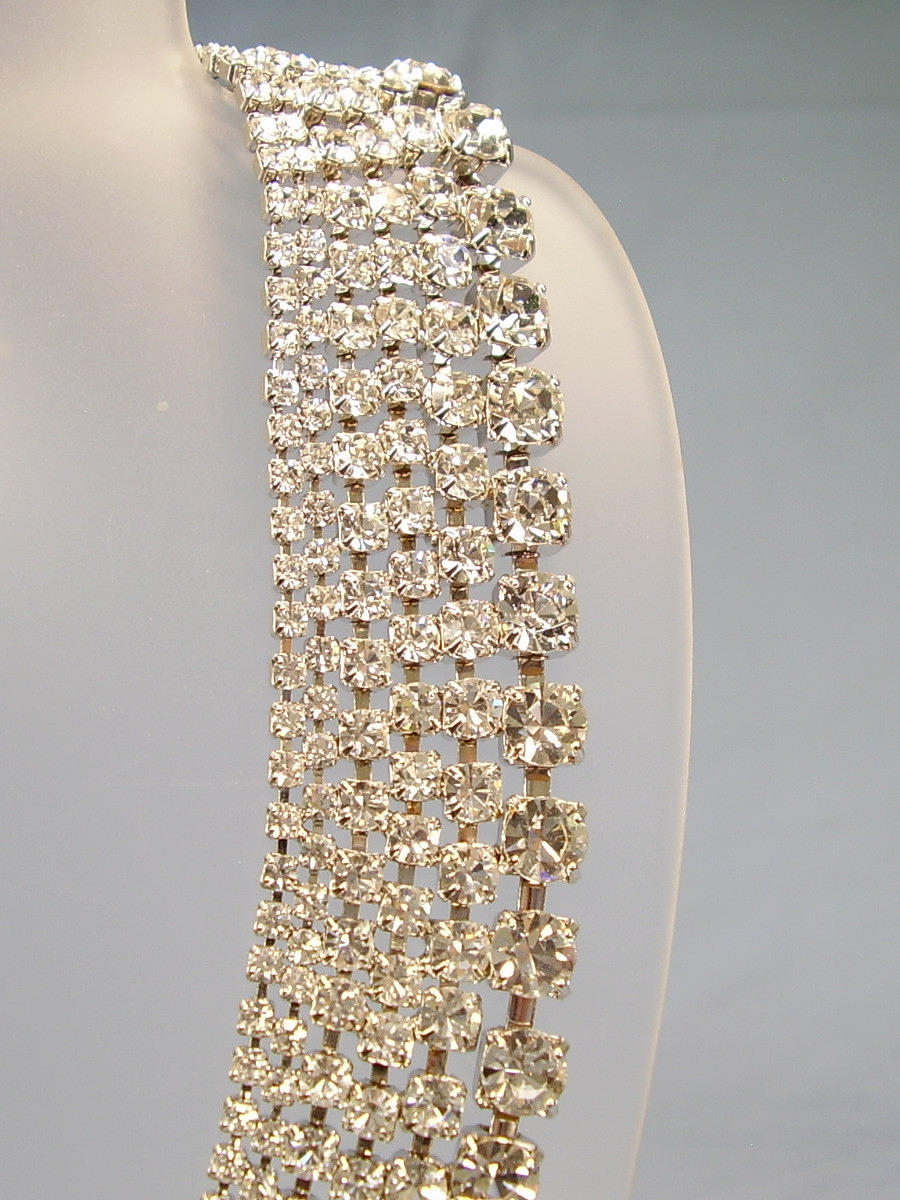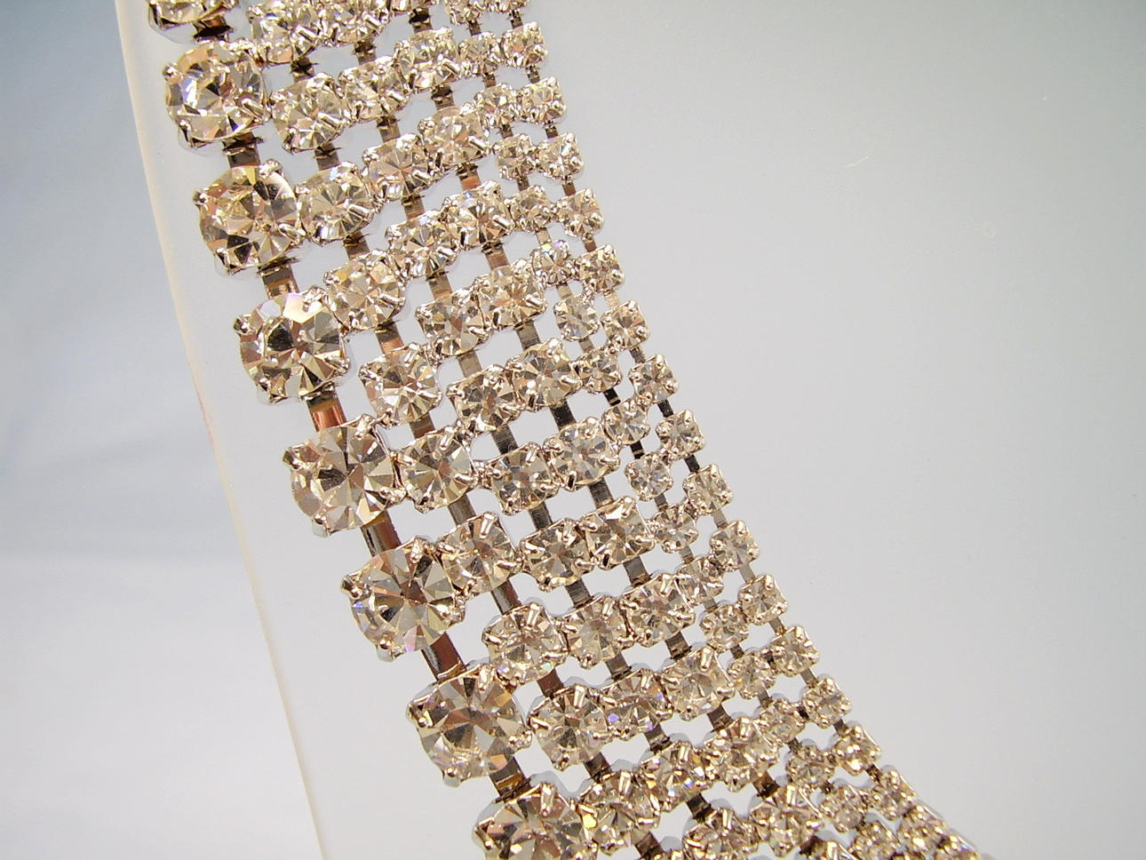 It is worked as a wide band, which is set with round, faceted, white rhinestones in increasing sizes.