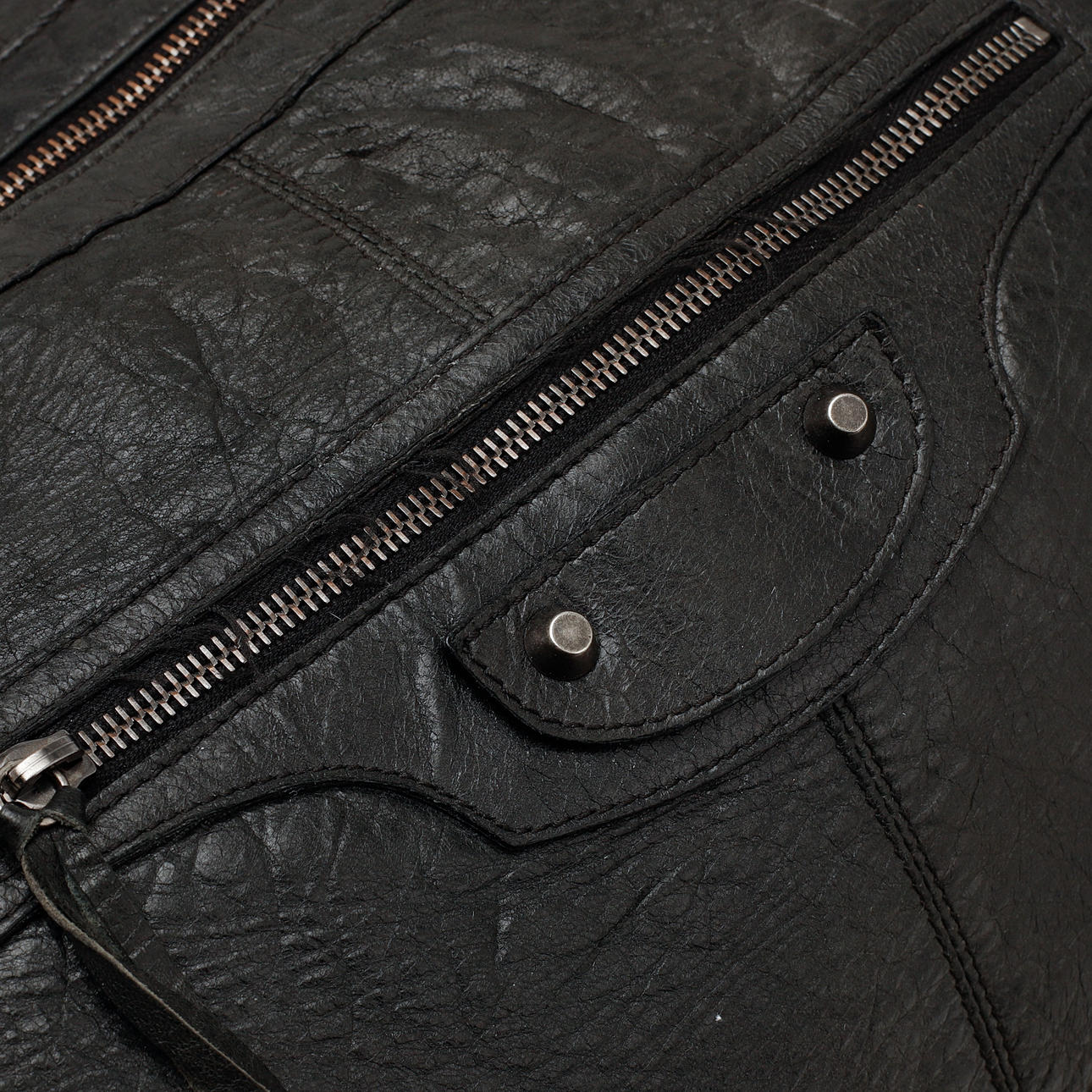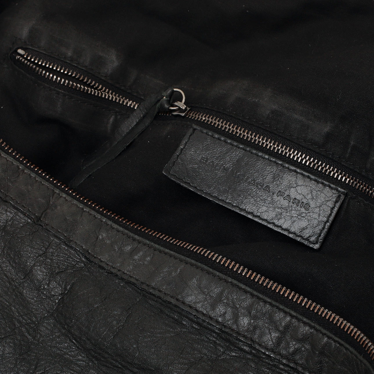 Black leather with removable shoulder strap, zipper. One outer pocket with zipper, one inner pocket with zipper. On numbered label "BALENCIAGA PARIS", Dustbag.