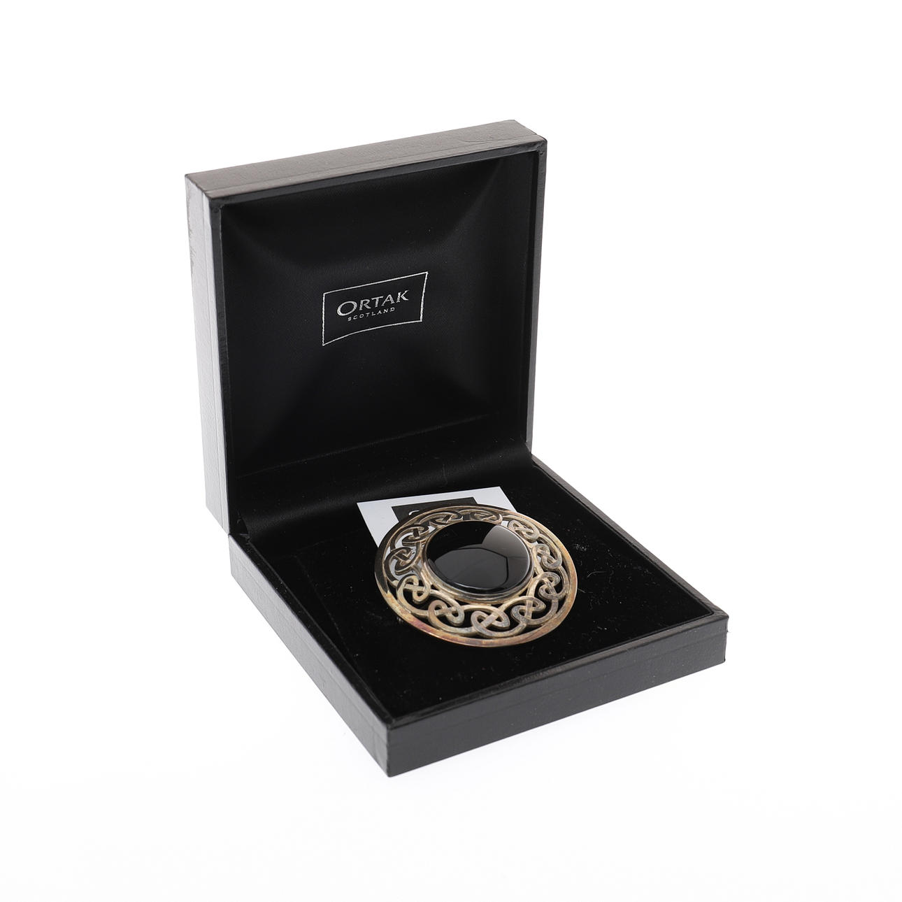 Orkney stone set silver buckler style brooch, 4.5cm diameter, cased, a FORD 25 years silver pendant, London 1979, on a curb link chain, cased, four articulated link silver neck-chains, 54gms and a snowflake pendant and chain, a FORD badge, a white paste set tiara, bird and butterfly brooches, two neck-chains and a brooch, 76g (qty)