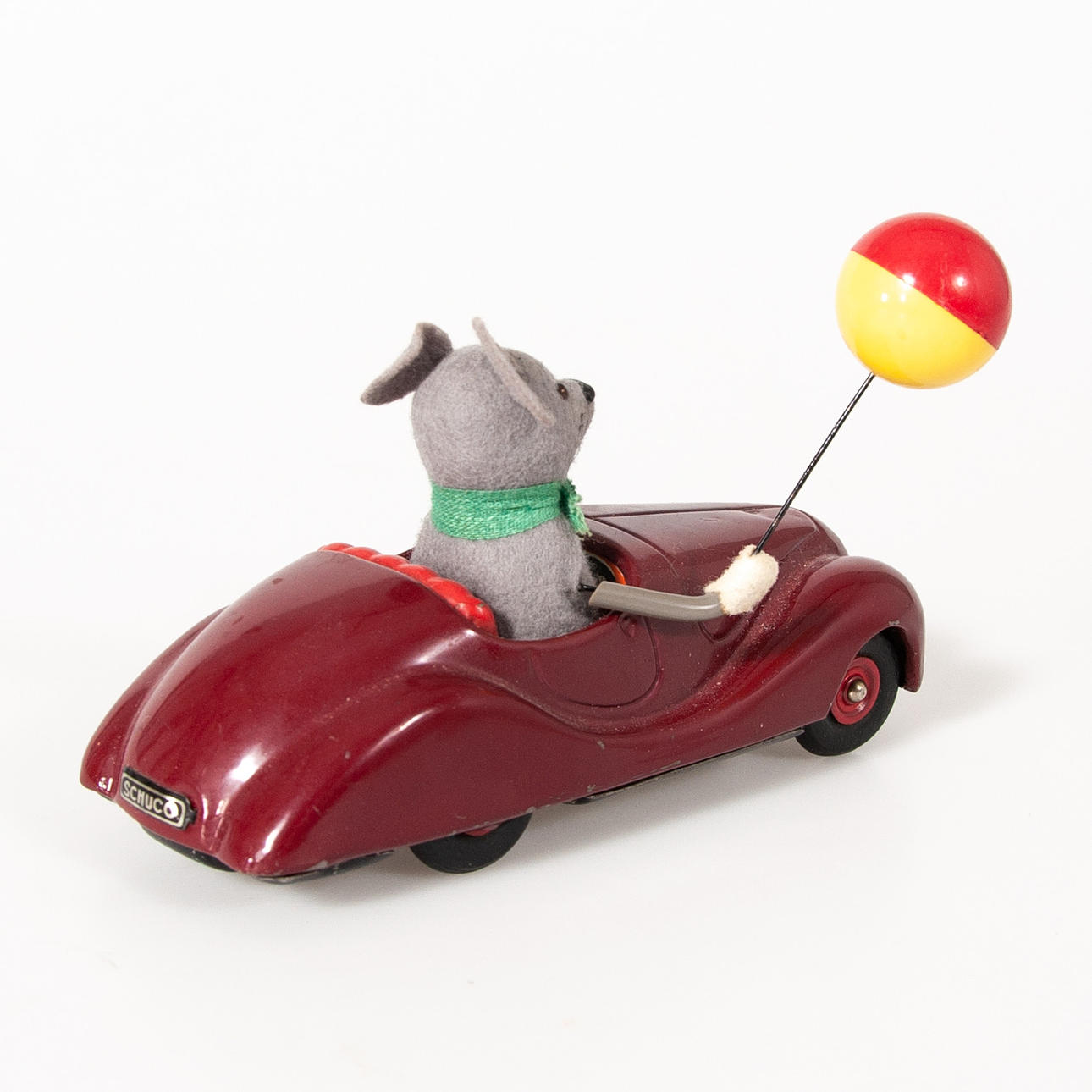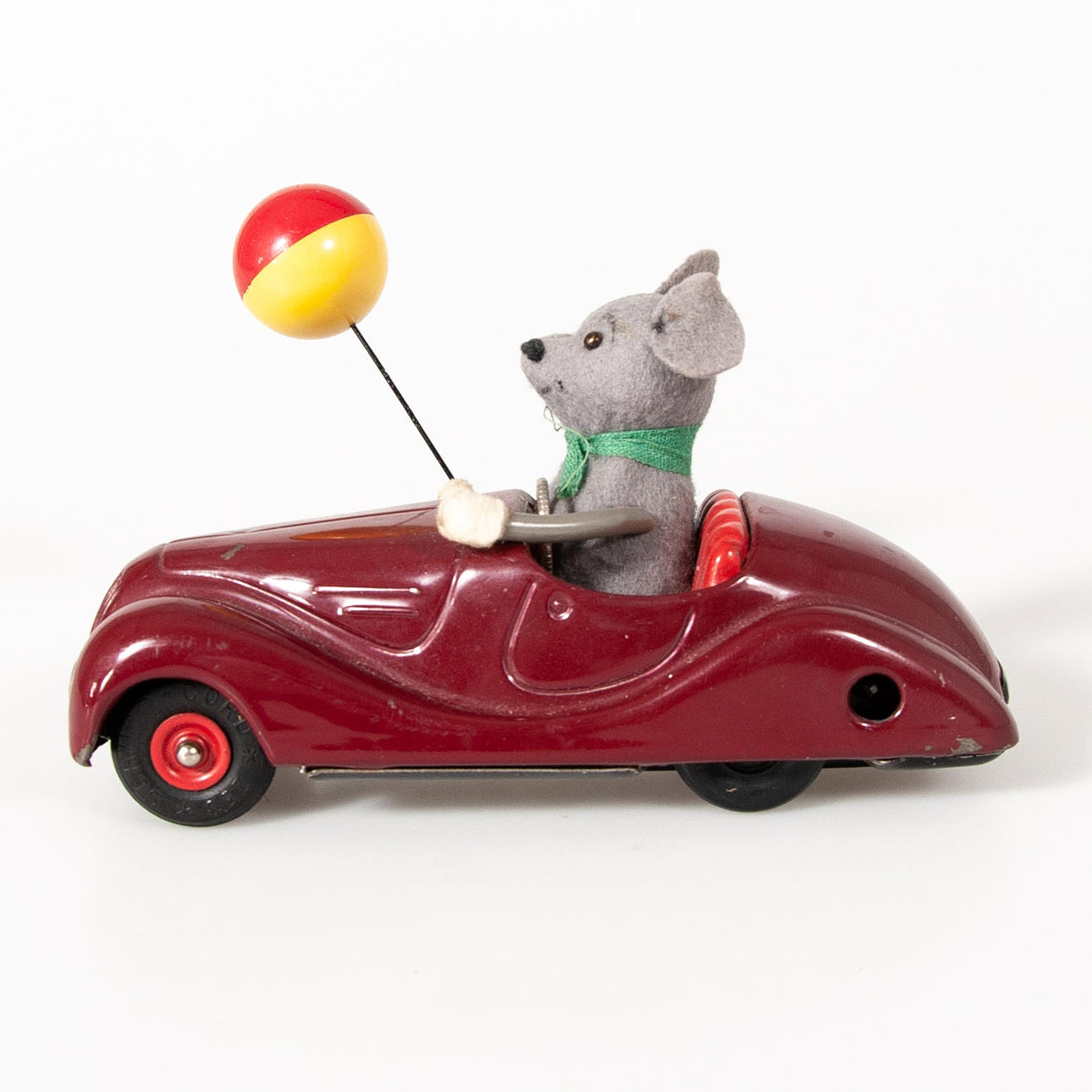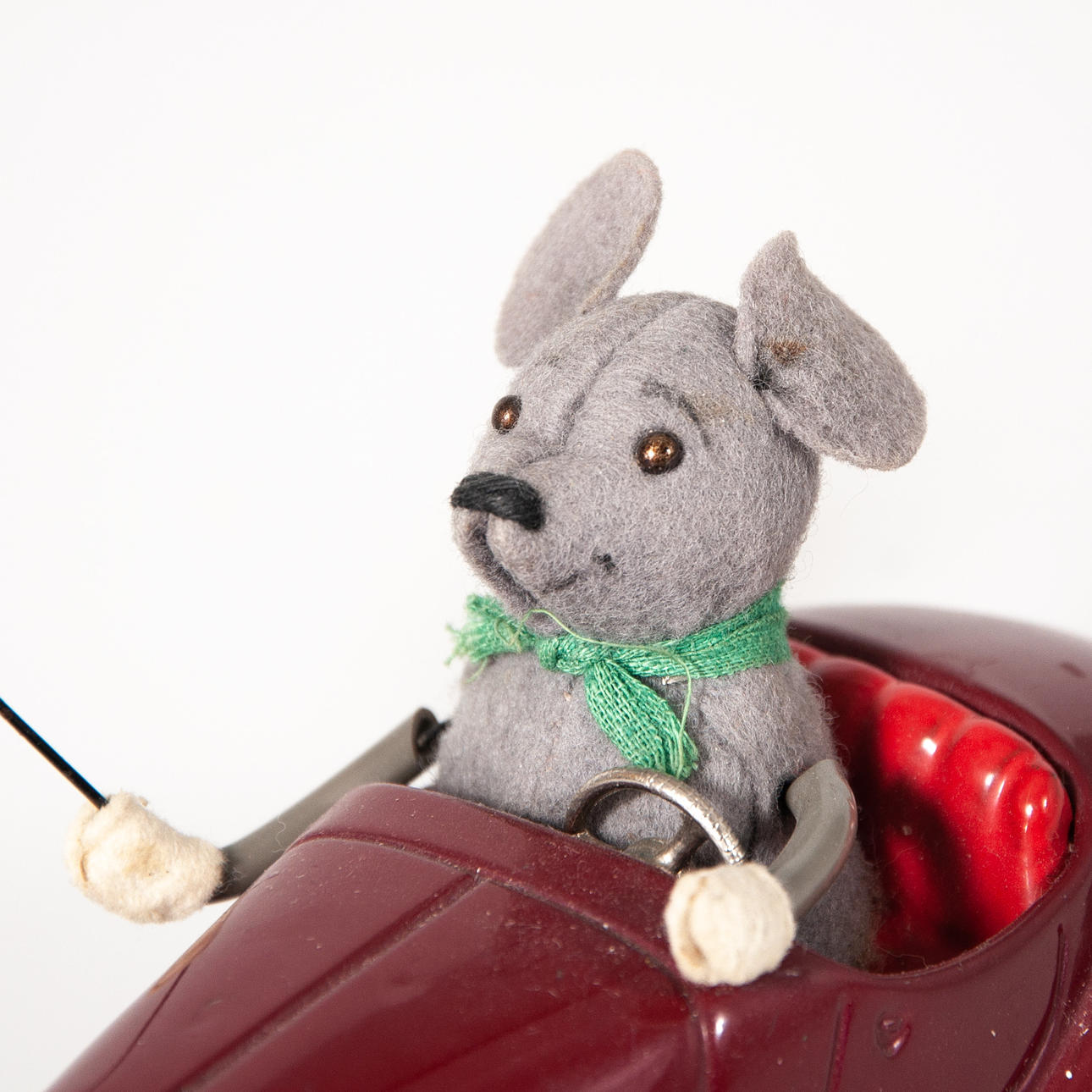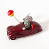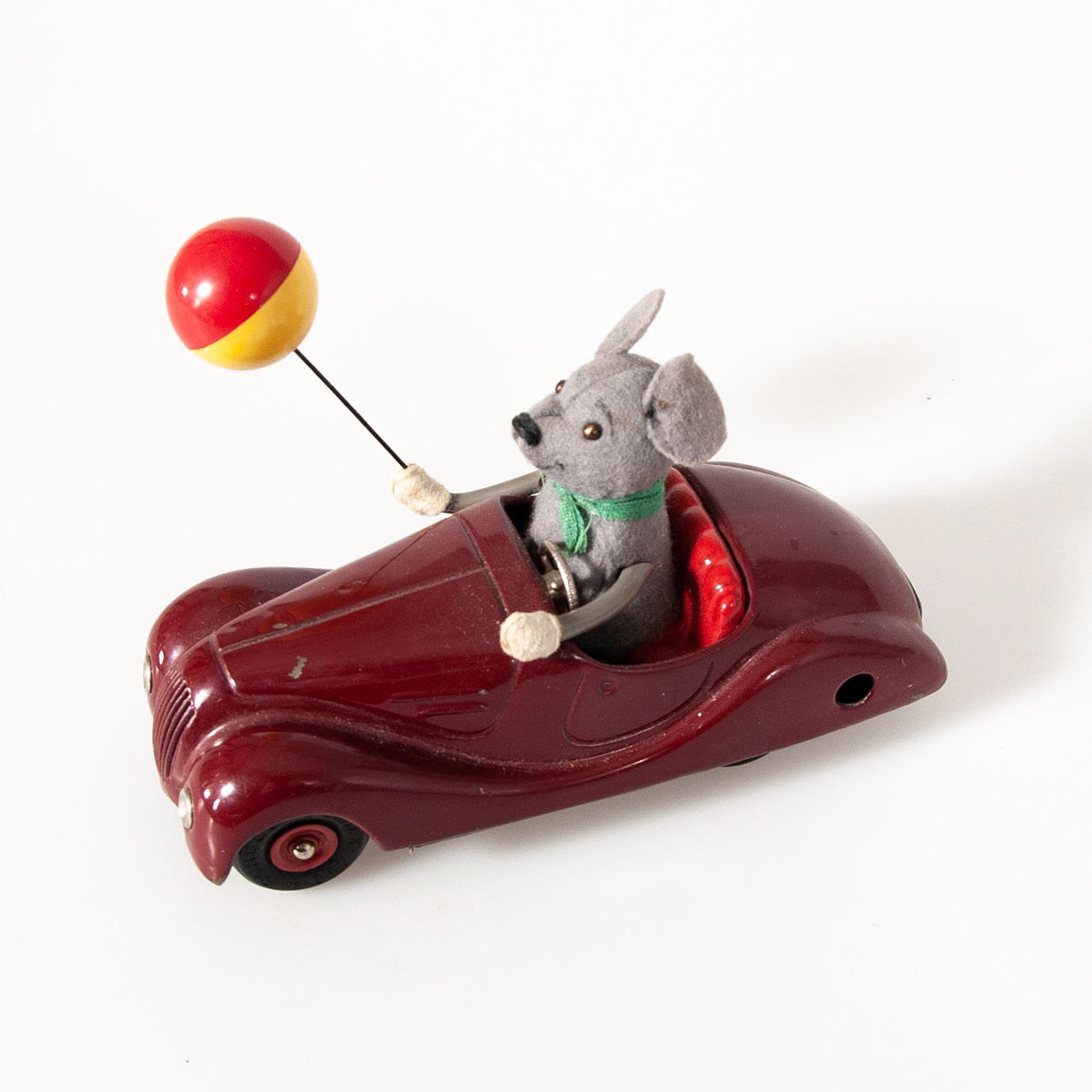 Varnished in burgundy. Felted mouse waving a balloon.