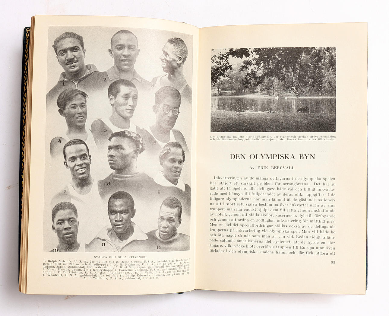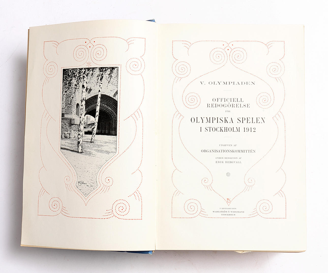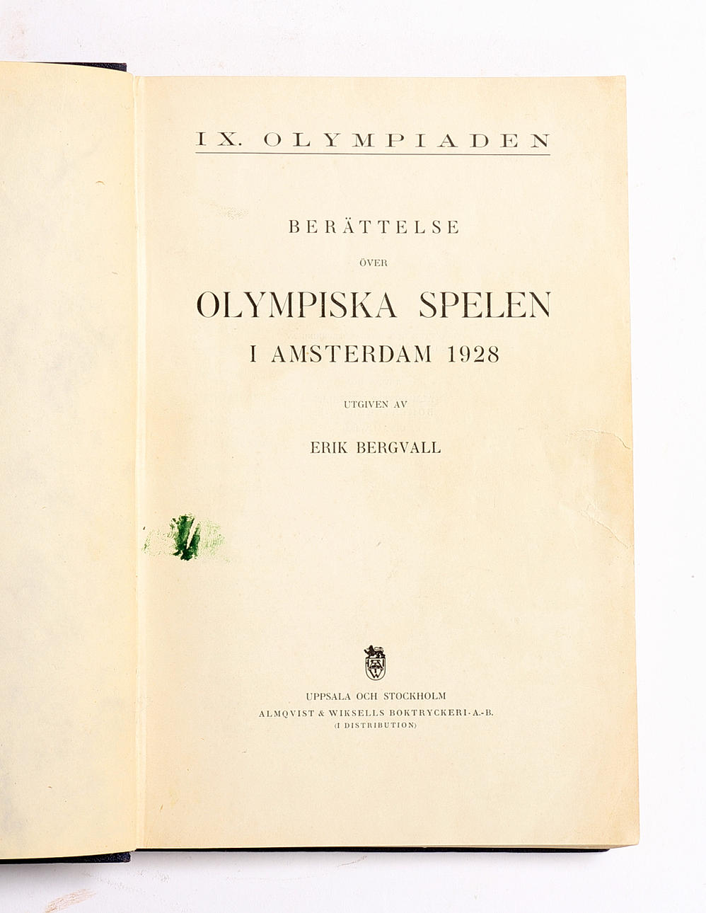V. The Olympiad. official statement. Red+d E Bergvall, 1913, decorated cloth + The Olympic Games in Antwerp 1920, red. E Bergvall, 1920, 4:o, hcloth + IX Olympiad, Amsterdam 1928, ed. E Bergvall, 1928, cloth + Olympiad in Lake Placid 1932, ed. E Bergvall, cl + XI Olympiad Berlin 1936, ed. E Bergvall 1936, cloth + doublet, leather binding.