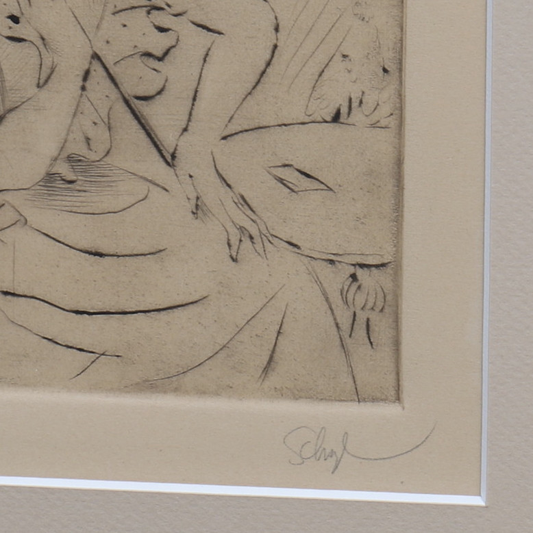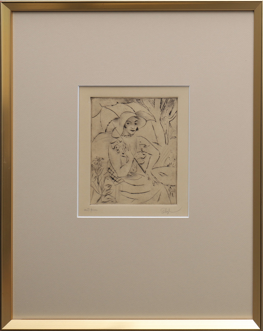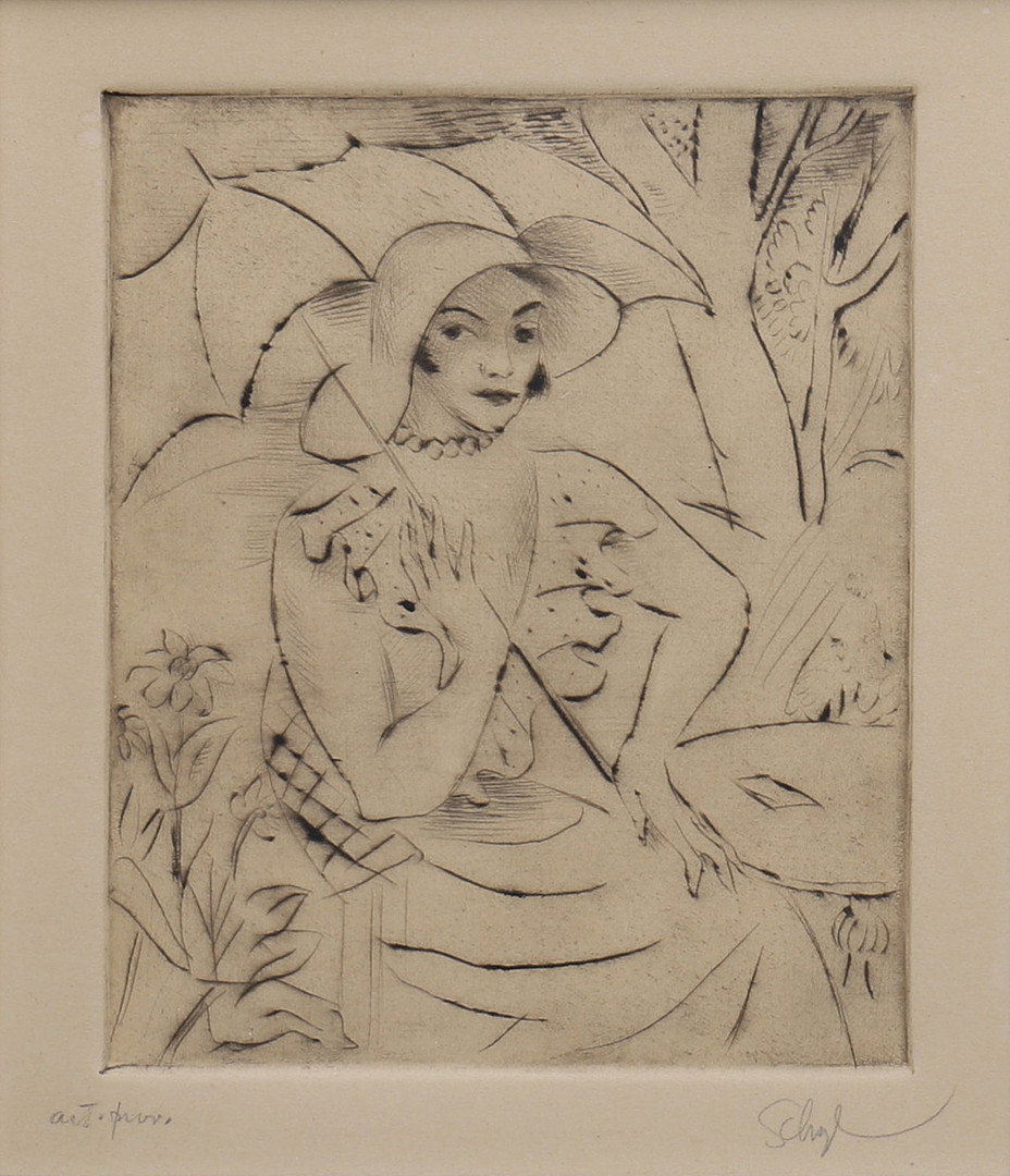 1664451. JULES SCHYL. WOMAN WITH UMBRELLA, etching.