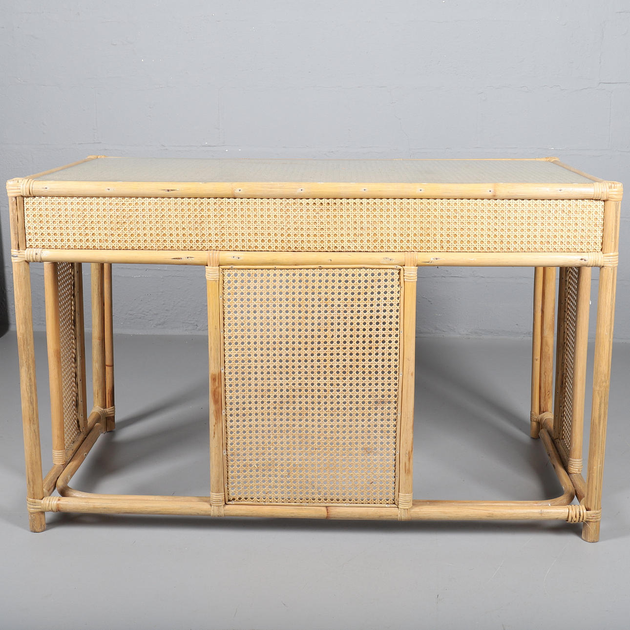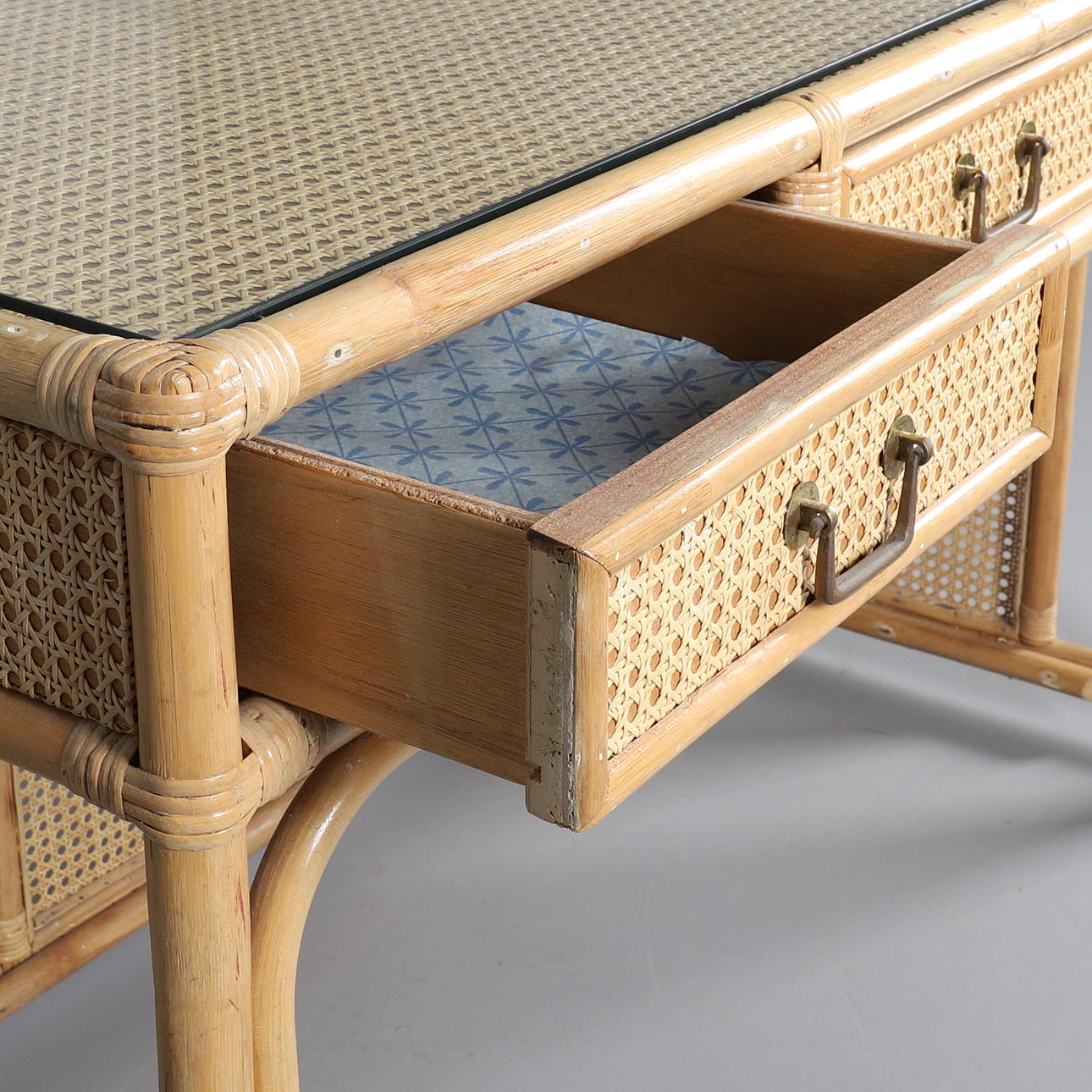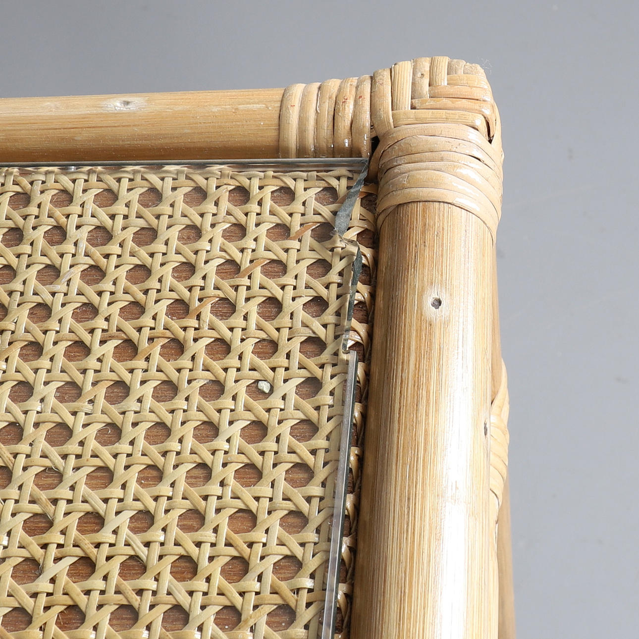 Some knocks and traces of paint to frame. One area of cane loose. Chip to glass top.
