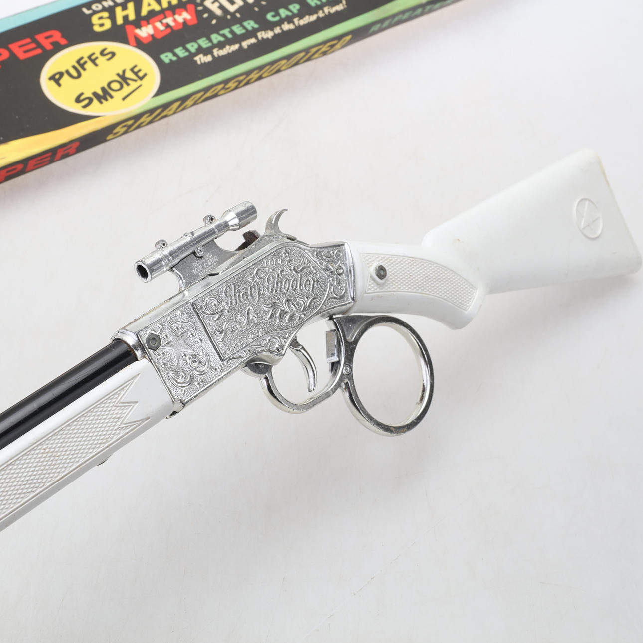 Repeater cap rifle, made in England Original box, the mechanism works Length 71 cm.