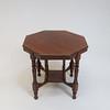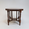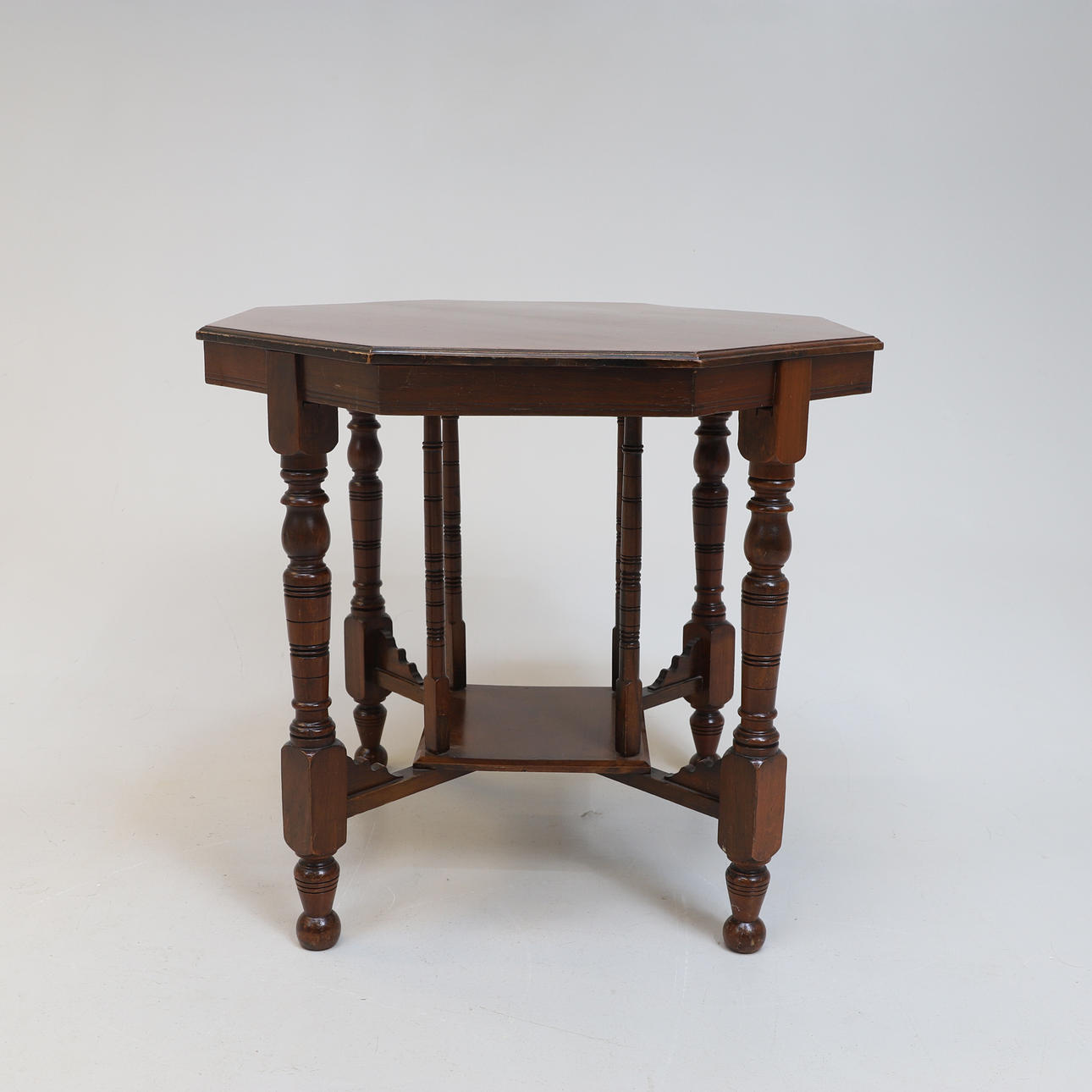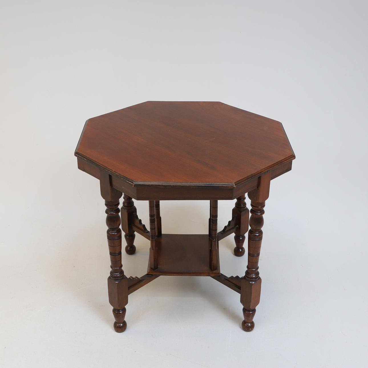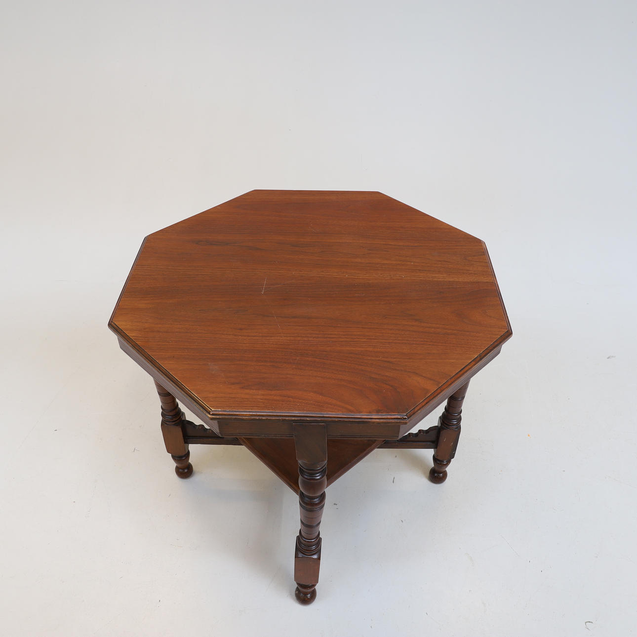 Frame in walnut. Cut and turned decor. Hexagonal disc. Coupled leg position.