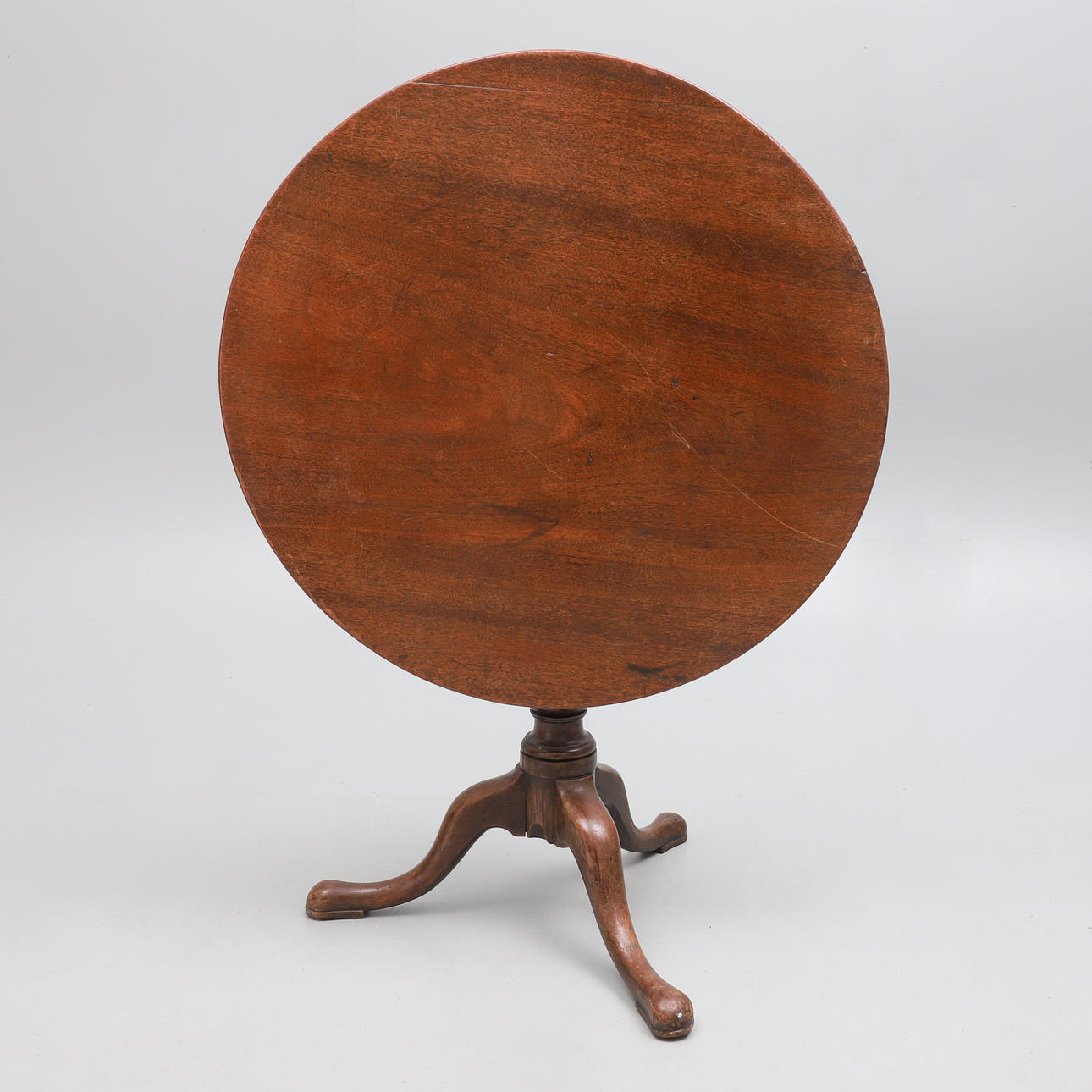 restored, the circular tilt-top on a birdcage and baluster turned pillar and tripod base, 83cm deep x 70cm high.