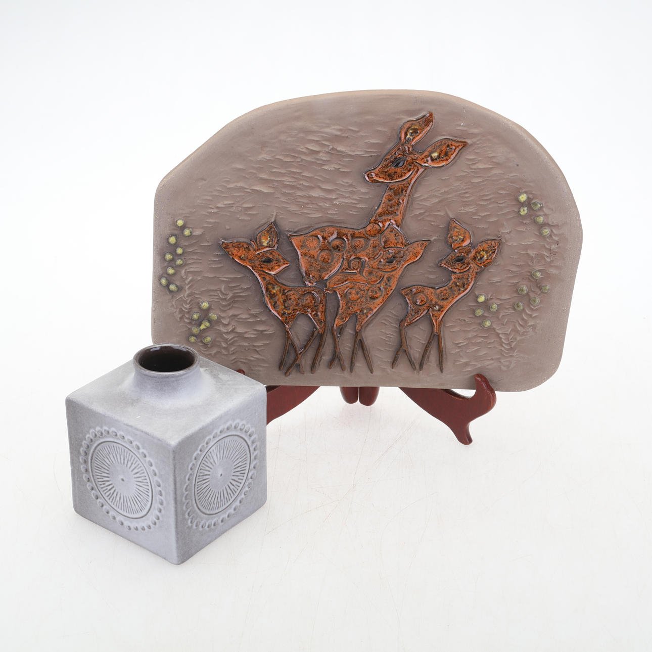 Wall plate, Upsala Ekeby 0147 E Ester Wallin. 27.5 cm x 21 cm Vase, Upsala-Ekeby 11 cm.