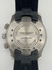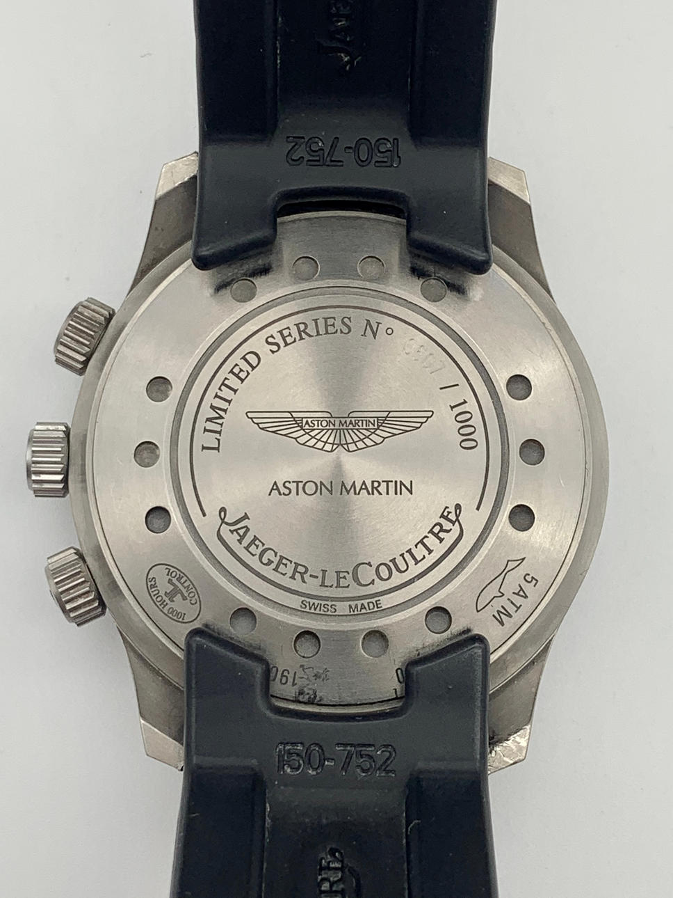 The water-resistant circular 42 mm. brushed titanium case comes with a screw back centred by Aston Martin logo, a domed sapphire crystal, three crowns, the one at 2 to set and wind the alarm, the one at 3 to set the inner bi-directional revolving grey disc calibrated for 1/5th of a second, the last one at 4 to set and wind the mean time. The snap on case back is engraved « Limited Series no. 309/1000 Aston Martin Jaeger-LeCoultre », bears 14 holes for a better sound dispersion.