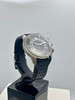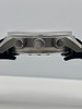 The two-tone grey satin dial, with central revolving disc for the alarm, concentric ring with 270 degrees painted large luminous Arabic numerals display and two-tone 15/30 minutes division for the alarm, aperture for the date at 3, luminous hands, sweep center seconds, outermost 1/5th second division with applied steel indexes. The arc of numerals inhabited 270° of the dial in sympathy with Aston Martin’s speedometers gracing car dashboard counters.